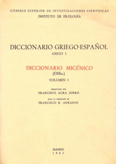 Aura Jorro, Francisco - Diccionario Griego-Español, Anejo I : Diccionario Micénico, Volumen I |