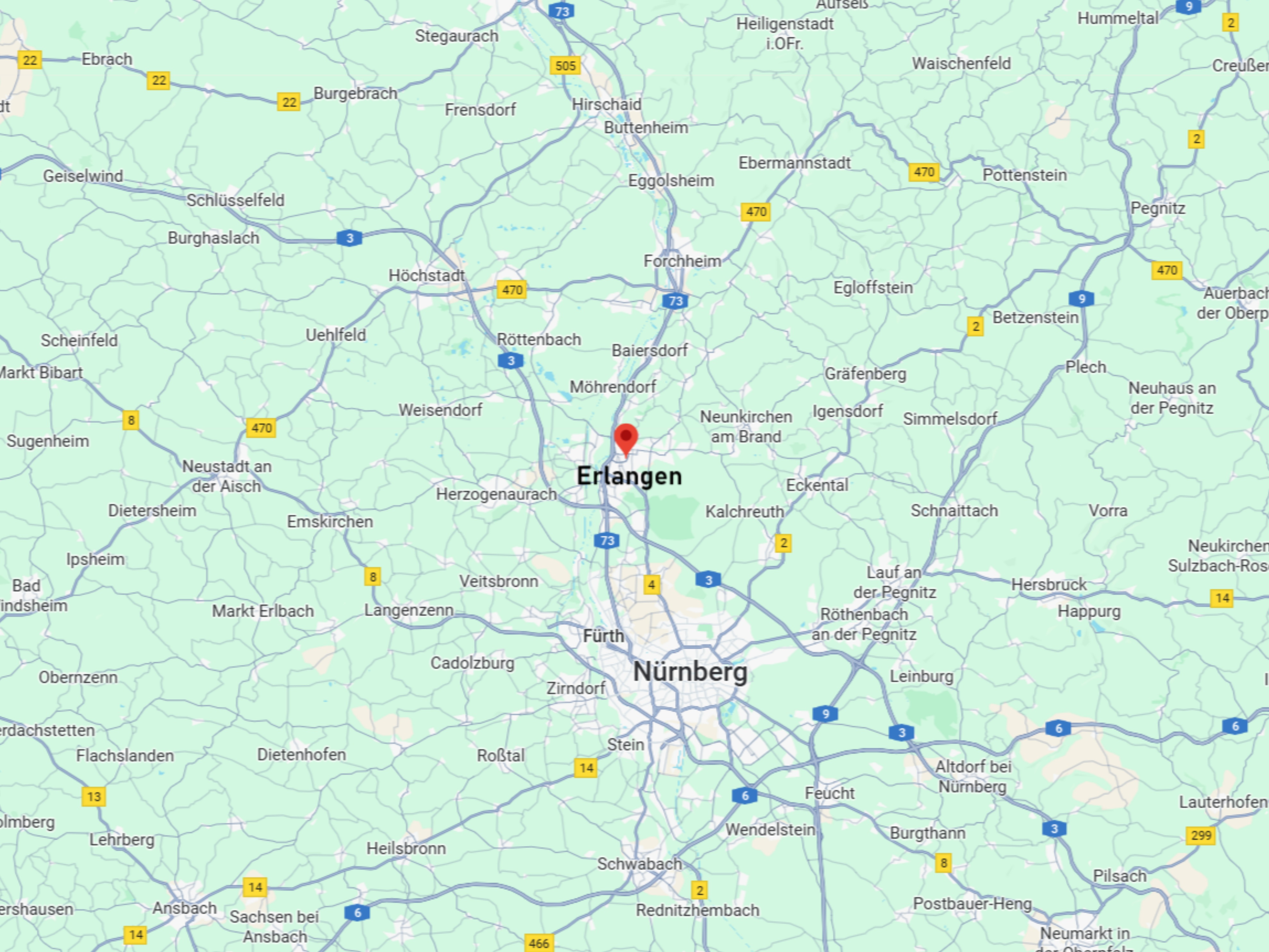 Erlangen: ![]() Erlangen liegt im Fränkischen Becken, genauer gesagt im Tal der Regnitz, eines kleinen Flusses, der südlich von Erlangen als Zusammenfluss von Rednitz und Pegnitz entspringt und nördlich von Bamberg in den Main mündet. Die Stadt wird erstmals 1002 schriftlich erwähnt, dürfte aber bereits mehrere Jahrzehnte zuvor gegründet worden sein. 1431 wurde die Stadt während der Hussitenkriege (1419–1434) vollständig zerstört; dies sollte nicht die letzte Zerstörung sein: Auch im Dreißigjährigen Krieg (1618–1648) wurde sie kriegszerstört. 1706 war ein Großbrand für die Zerstörung verantwortlich, doch Erlangen überstand die Bombenangriffe auf Nazi-Deutschlands relativ gut. Traditionell war Erlangen eine Garnisonsstadt, und 1743 kam eine Universität hinzu, die ein Jahr zuvor in Bayreuth gegründet worden war. Diese Friedrich-Alexander-Universität Erlangen-Nürnberg und die Siemens AG sind heute die wichtigsten Arbeitgeber der Stadt. Erlangen überschritt im Jahr 1974 die 100.000-Einwohner-Marke und hatte am 31. Dezember 2024 115.928 Einwohner; die Stadtfläche beträgt 76,96 km². |