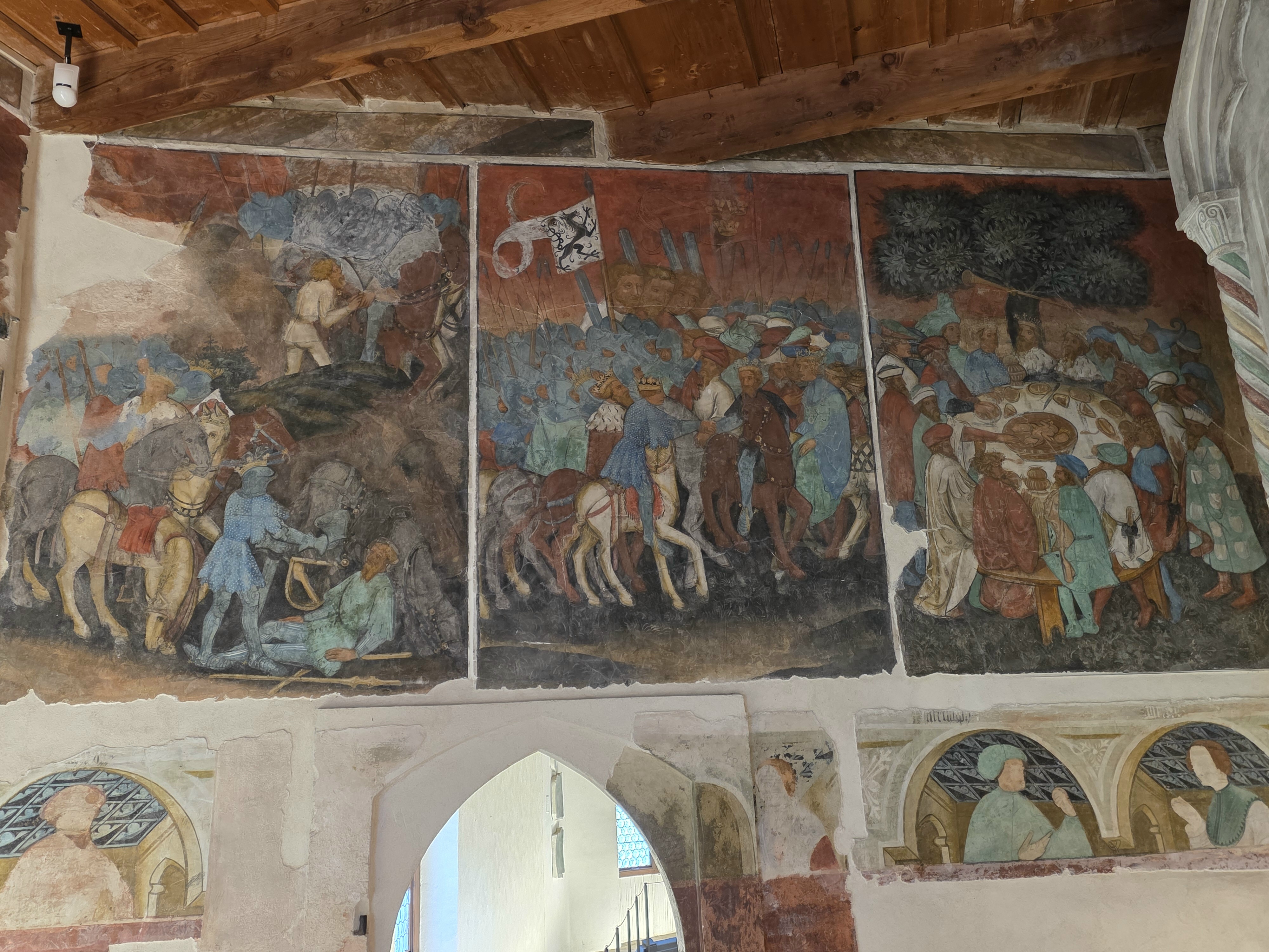 Ritten (Renon): Schloss Runkelstein Schloss Roncolo: Das sogenannte Sommerhaus beherbergt unter anderem das Garel-Zimmer mit einem Fresko, das die Abenteuer des Gralsritters Garel erzählt: Er befreit Königin Ginover (Guinevere), die Gemahlin von König Artus, aus den Händen von Räubern und wird daraufhin aus Dankbarkeit in den Orden der Ritter der Tafelrunde aufgenommen. © Foto 2025 |