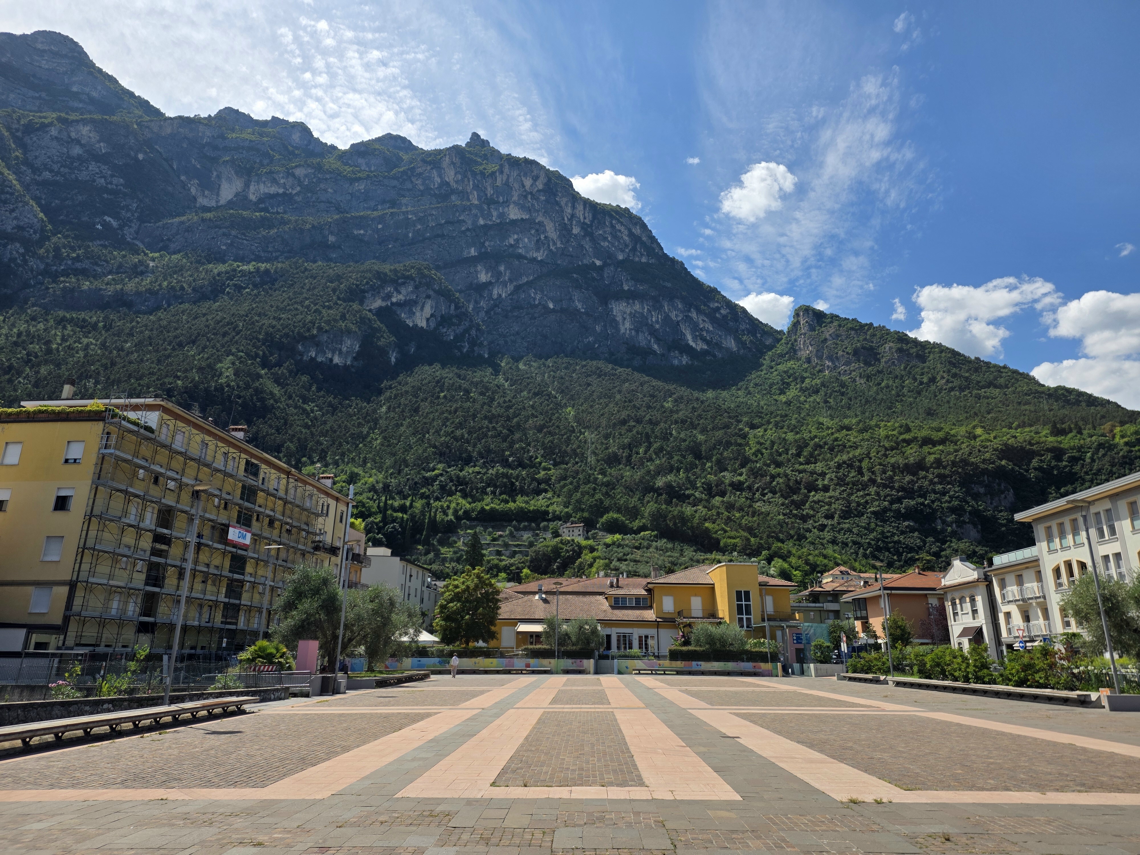 Unterhalb dieses Platzes, nördlich des Stadtzentrums von Garda, liegen die Ruinen eines römischen Badehauses. Im Hintergrund ist der Monte Rochetta zu sehen.