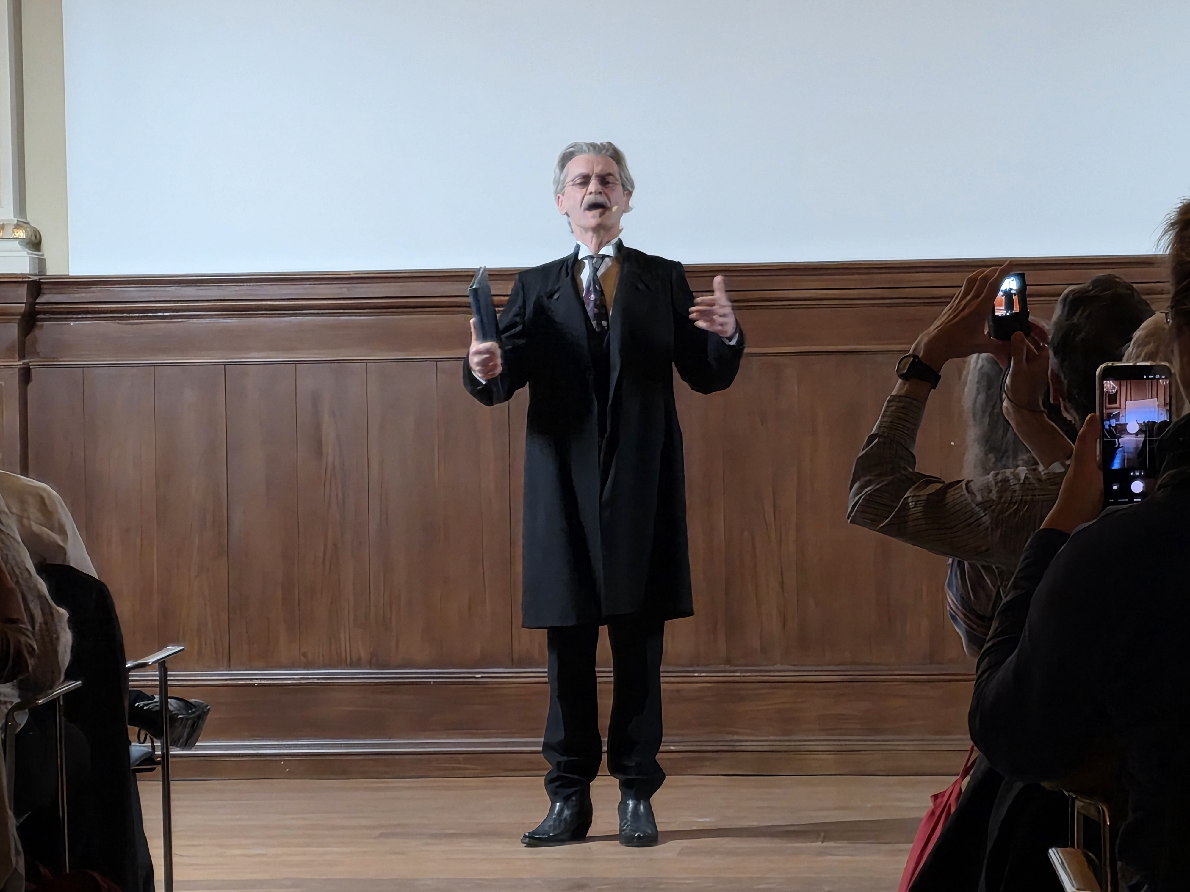 Rostock, Universitätsplatz 1: Universität Rostock: Das Abendprogramm des ersten Kongresstages (2. Oktober 2025) gestalteten Robby Langer (* 1961) und Roland Wichmann (* 1968), die ein Theaterstück basierend auf dem Briefwechsel zwischen Karl May und Sascha Schneider (vollständig: Rudolph Karl Alexander Schneider, * 21. September 1870, 18. August 1927) inszenierten. Hier sieht man Robby Langer in der Rolle des Karl May. © Foto 2025 |
