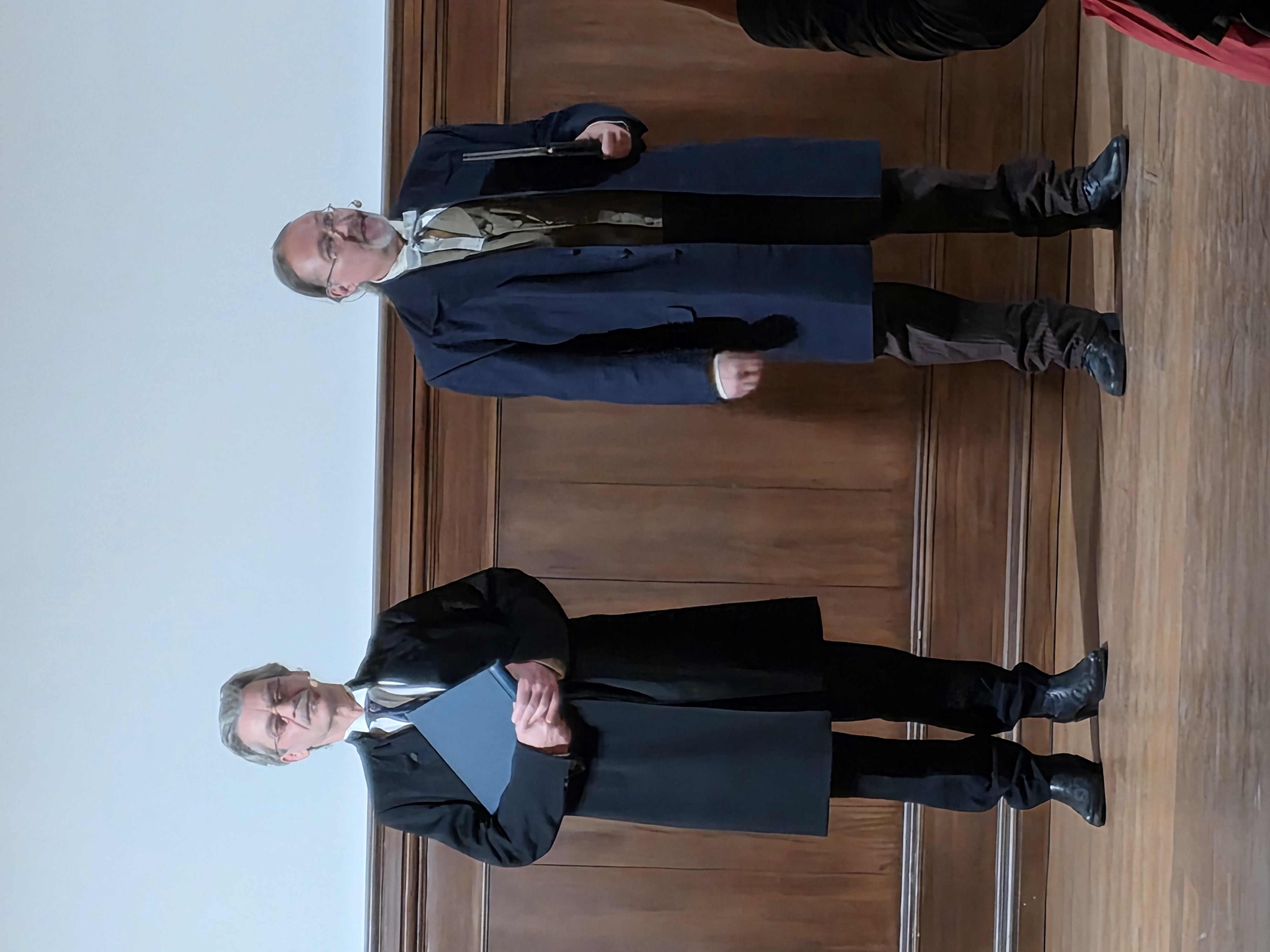 Rostock, Universitätsplatz 1: Universität Rostock: Das Abendprogramm des ersten Kongresstages (2. Oktober 2025) gestalteten Robby Langer (* 1961) und Roland Wichmann (* 1968), die ein Theaterstück basierend auf dem Briefwechsel zwischen Karl May und Sascha Schneider (vollständig: Rudolph Karl Alexander Schneider, * 21. September 1870, 18. August 1927) inszenierten. Hier sieht man Langer in der Rolle des Karl May und Wichmann als Saschs Schneider. © Foto 2025 |
