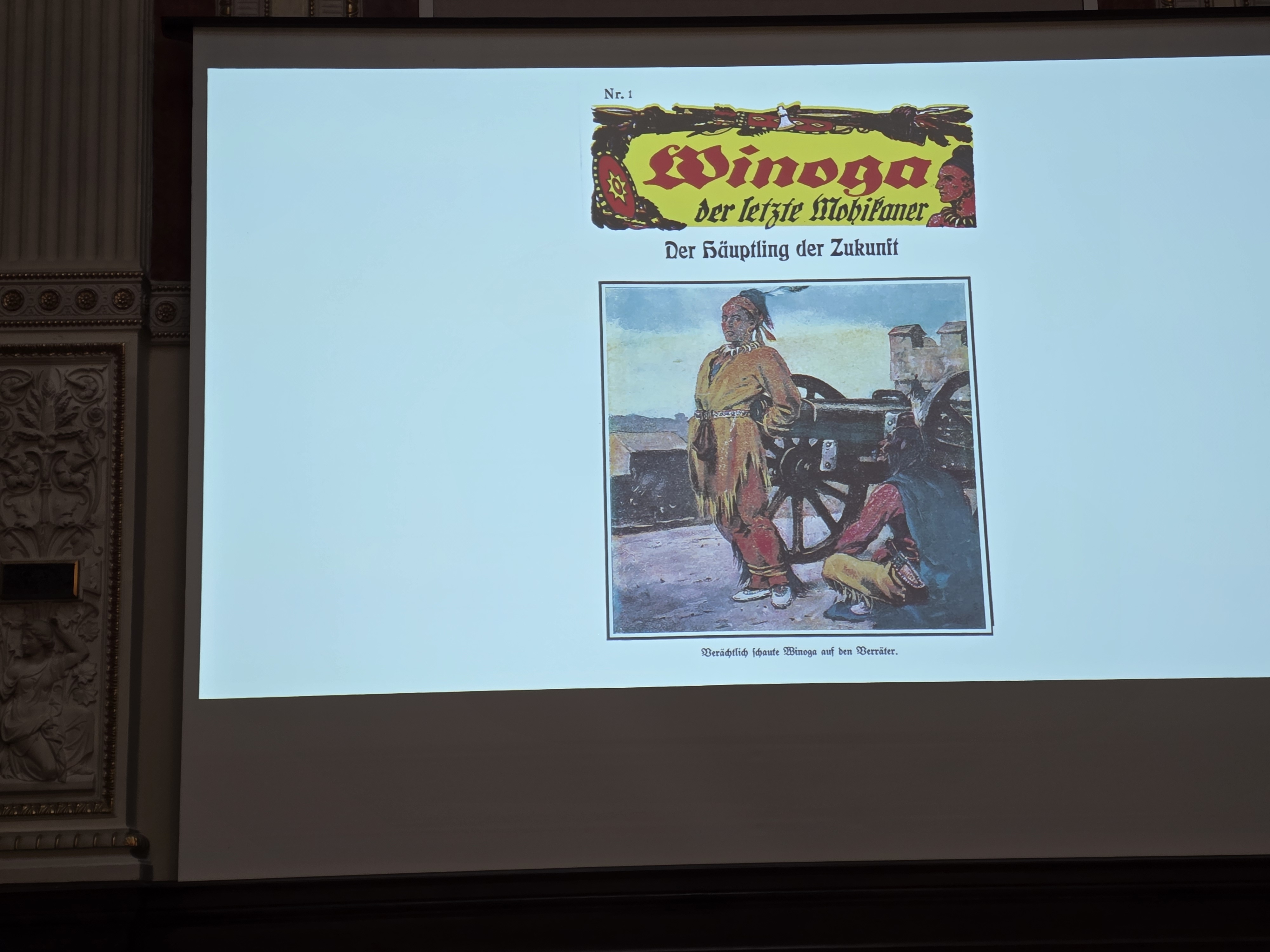 Dr. Wolfgang Griep (* 1948) diskutierte zum Thema „Der edle Häuptling Winoga und andere Helden. Das Berliner Verlagshaus für Volksliteratur und Kunst”. Nicht weniger als 90 Teile des Dreigroschenromans Winoga, der letzte Mohikaner wurden zwischen 1921 und 1924 veröffentlicht. Der Titel lässt bereits vermuten, dass es sich um eine Kreuzung zwischen Winnetou und Last of the Mohicans handelt.