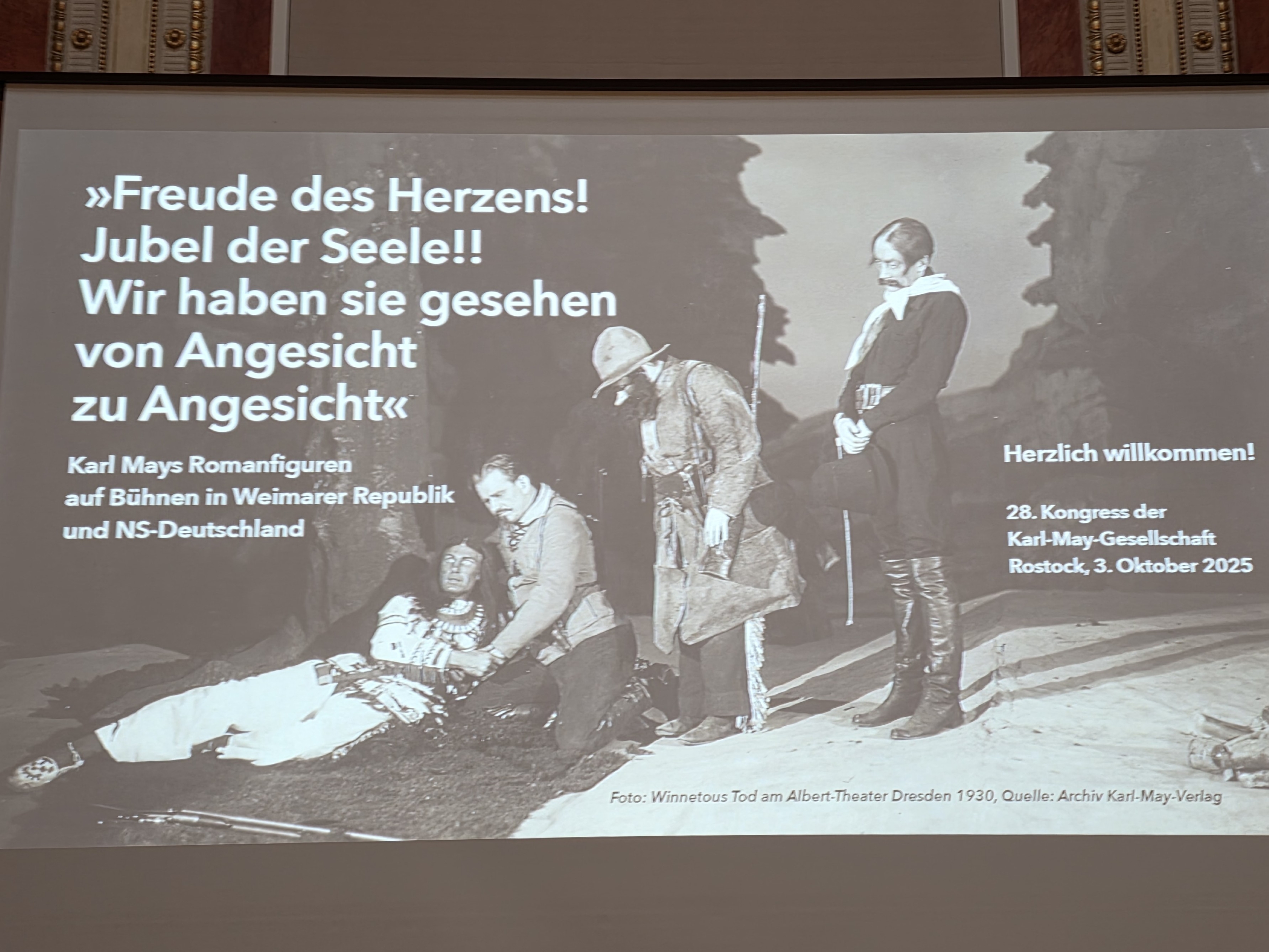 Der zweite Vortrag dieses Tages, 3. Oktober 2025, stammt von Nicolas Finke (* 2. September 1977; Pressereferant eines TV-Unternehmens; von September 2003 bis Mai 2014 Herausgeber der Zeitschrift „Karl May & Co. Das Karl-May-Magazin” und Co-Autor u. a. der vierteiligen Reihe »Karl May auf der Bühne«) und trägt den Titel „Freude des Herzens! Jubel der Seele!! Wir haben sie gesehen von Angesicht zu Angesicht“. Karl Mays Romanfiguren auf Bühnen in Weimarer Republik und NS-Deutschland.