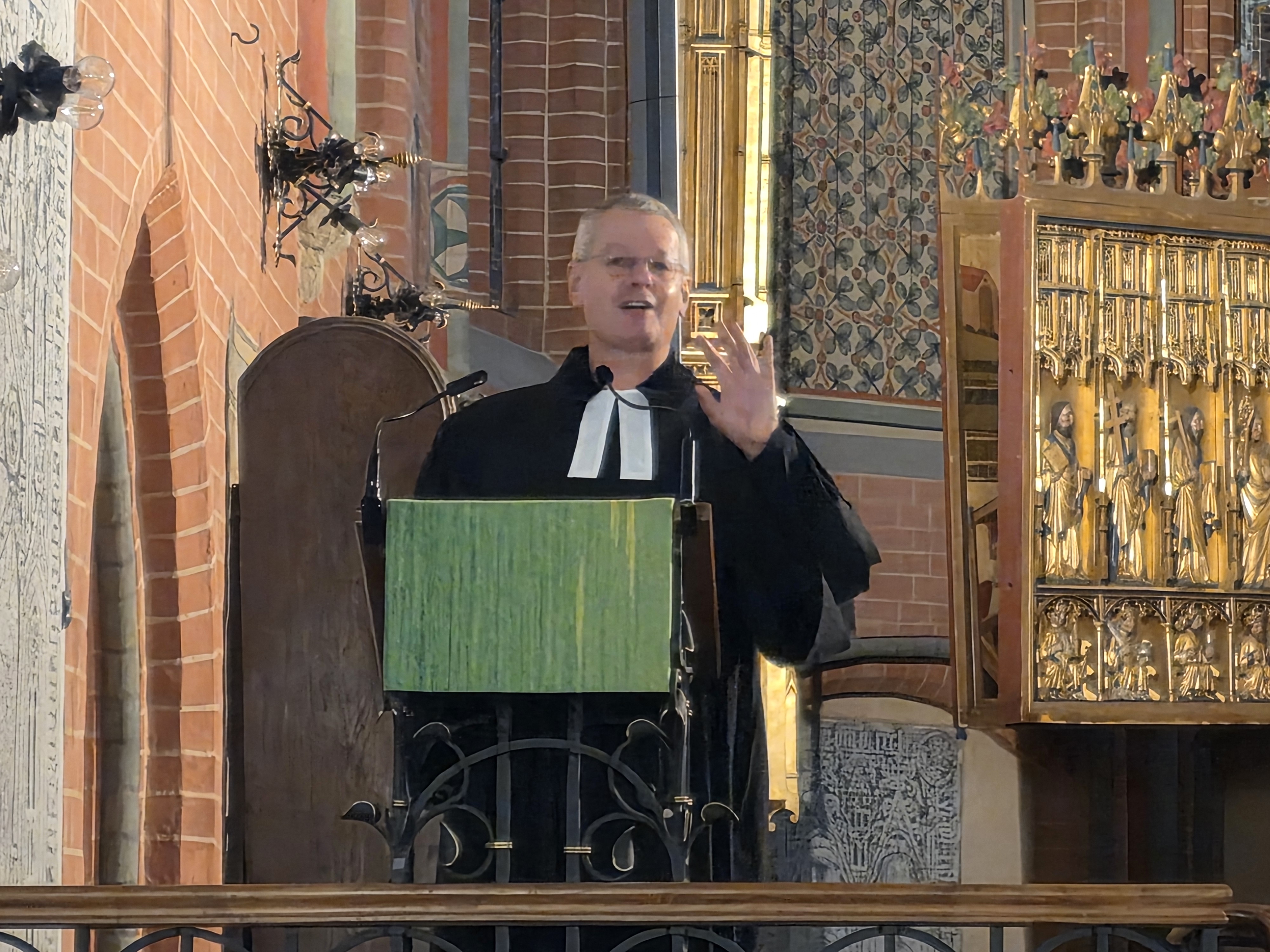 Rostock, Klosterhof 7: Universitätskirche zum Hl. Kreuz: Nach den Hieroglyphen folgte der traditionelle ökumenische Gottesdienst, geleitet von dem österreichischen Pfarrer Oliver Gross (geb. 1969; Pfarrer in Bad Hall und Militärseelsorger für die Bundesländer Salzburg, Tirol und Vorarlberg) und ... © Foto 2025 |