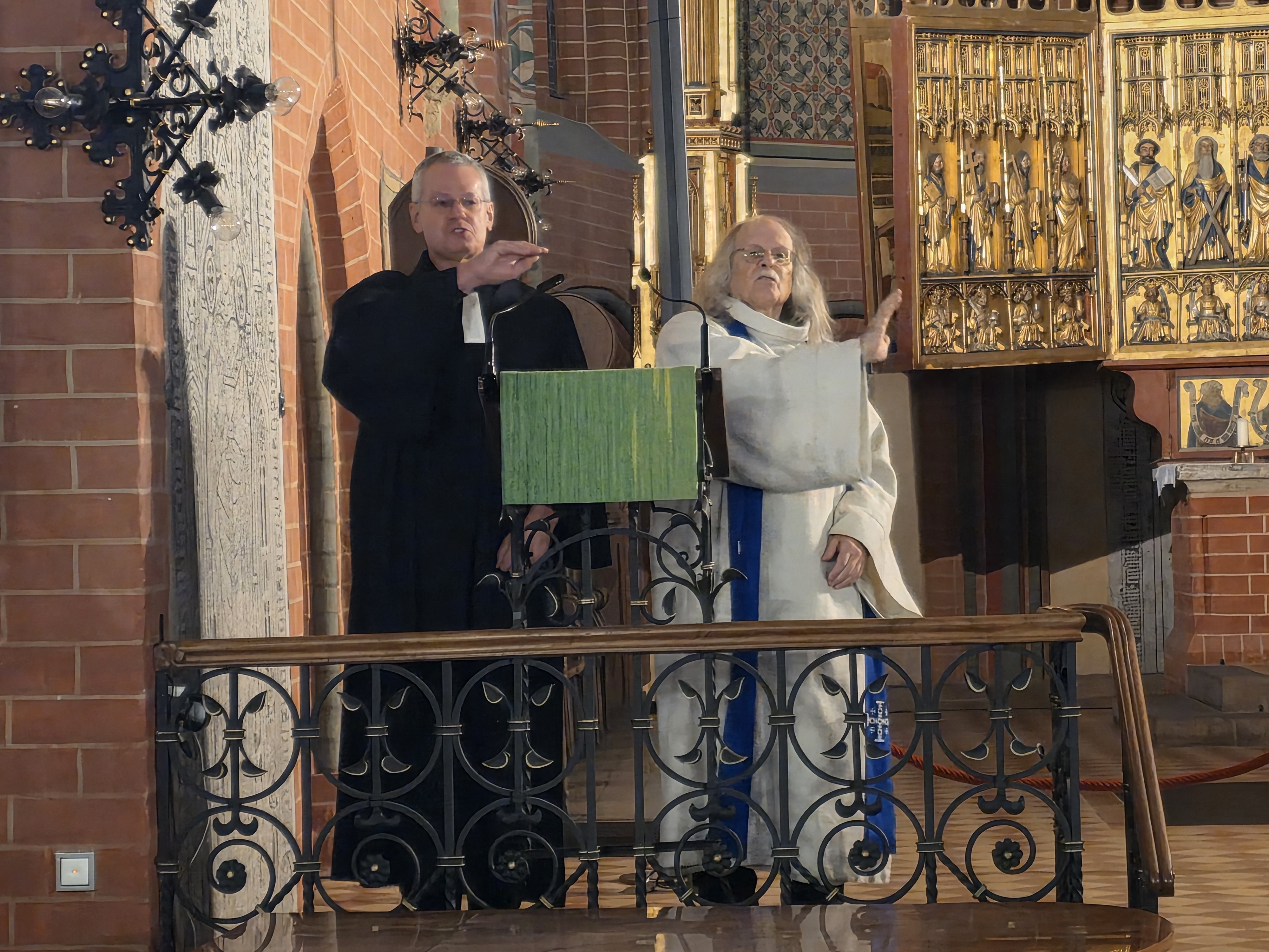 Rostock, Klosterhof 7: Universitätskirche zum Hl. Kreuz: Der evangelische Pfarrer Oliver Gross (* 1969; Pfarrer in Bad Hall und Militärseelsorger für die Länder Salzburg, Tirol und Vorarlberg) und der katholische Pfarrer Willi Stroband (* 9. Januar 1958; Pfarrer der katholischen Pfarrgemeinde St. Bartholomäus in Ahlen). Beide Geistlichen übermittelten die religiöse Botschaft mit einer Mischung aus Humor und Ernsthaftigkeit; gäbe es mehr dieser Art von Pfarrern, so wären die Kirchen jede Woche bestimmt voll. © Foto 2025 |