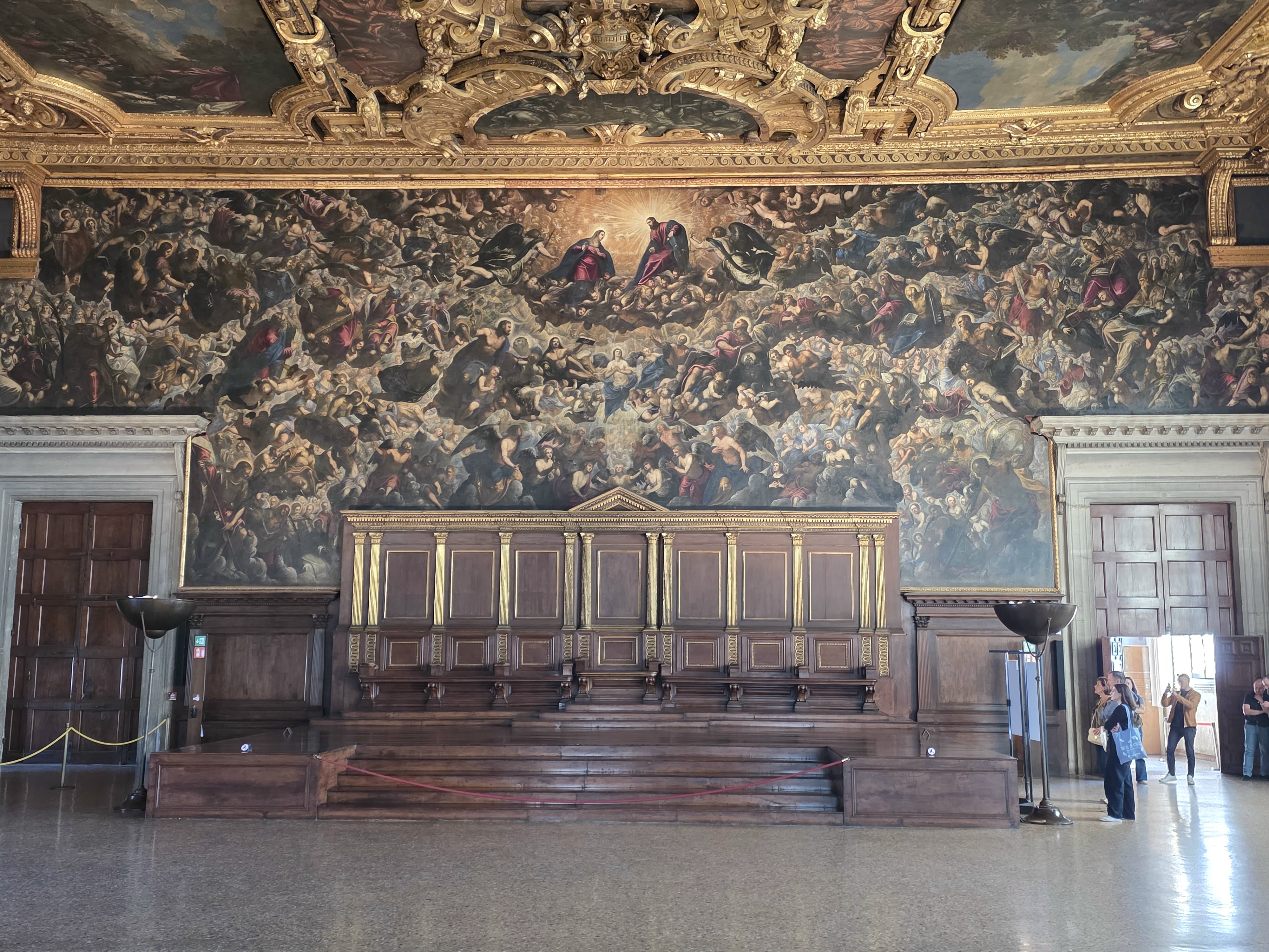 Venedig (Venezia), Piazzetta San Marco 1: Palazzo Ducale (Dogenpalast): Die Sala del Maggior Consilio stammt aus dem 14. Jahrhundert und ist mit 53 x 25 Metern der größte Saal im Dogenpalast. Hier tagte der Maggior Consilio (Große Rat), die höchste politische Institution der Republik Venedig. Alle männlichen Mitglieder patrizischer Familien ab 25 Jahren waren Mitglieder, unabhängig von ihrem Stand, ihren Verdiensten oder ihrem Vermögen. Ein Brand im Jahr 1577 zerstörte den Saal, doch er wurde rasch wiederaufgebaut und unter anderem mit dem Gemälde »Gloria del Paradiso« von Jacopo Robusti (besser bekannt als Tintoretto, * Sept./Okt. 1518, 31. Mai 1594) geschmückt, einem der größten Leinwandgemälde der Welt. Es zeigt rund 500 Figuren, mit der Jungfrau Maria im oberen Zentrum, die für Jesus Christus Fürsprache einlegt; auch die Taube des Heiligen Geistes ist dargestellt. Darunter befindet sich eine dichte Reihe von Cherubim und Seraphim. Im unteren Zentrum öffnet sich ein leuchtender Pfad, durch den die Gerechten zum Himmel aufsteigen und Gottes Gnade auf den Dogen herabströmen kann. In der Mitte dieses leuchtenden Pfades steht ein halbverschleierter Erzengel. © Foto 2025 |