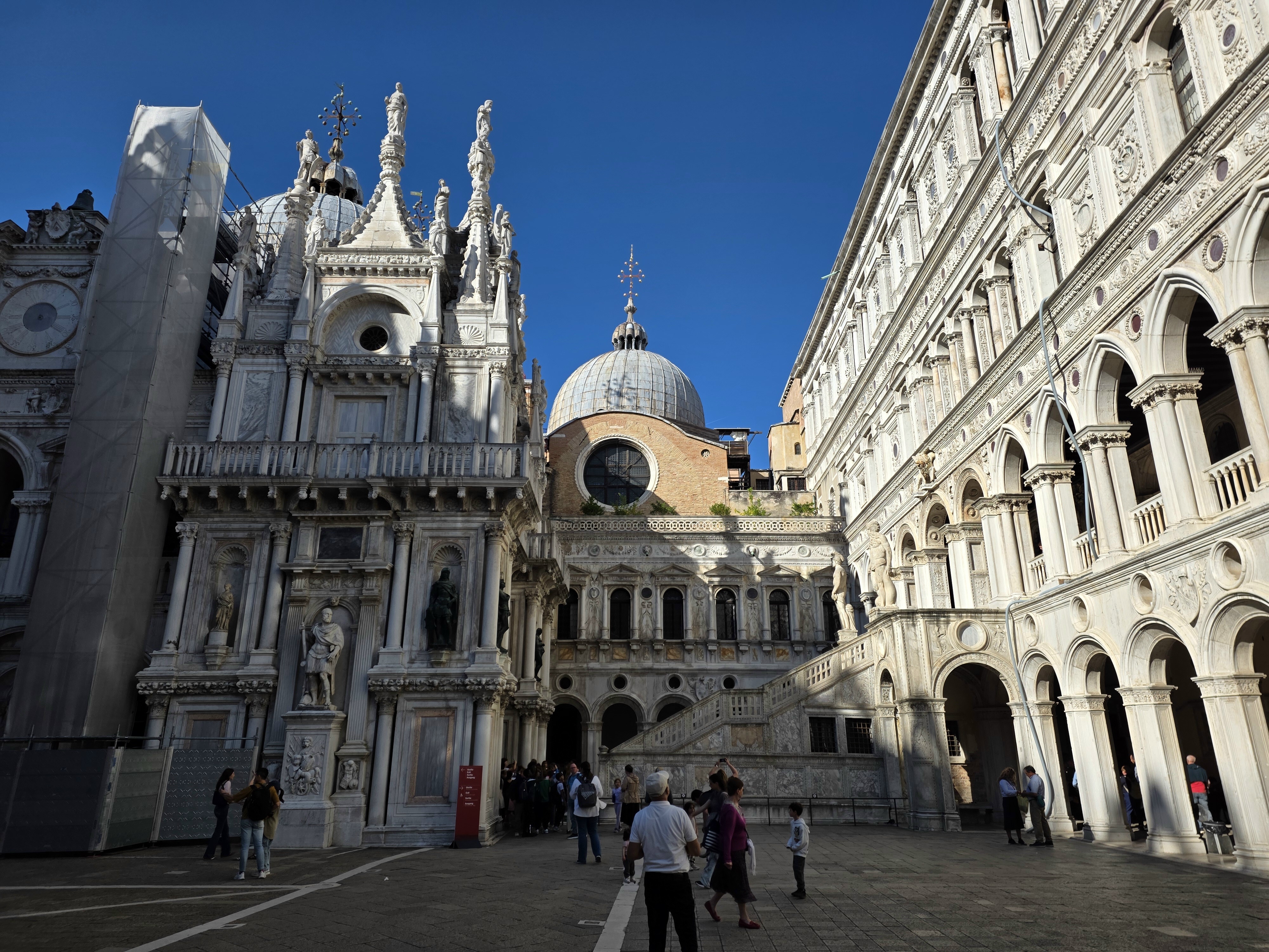 Venedig (Venezia), Piazzetta San Marco 1: Palazzo Ducale: Die Kuppeln der Basilica Cattedrale Patriarcale di San Marco (Patriarchalbasilika San Marco, kurz Markusdom) überragen den Hof des Palazzo Ducale (Dogenpalast). Rechts auf dem Bild befindet sich die Scala dei Giganti (Gigantentreppe): Sie wurde nach einem Brand im Jahr 1483 erbaut; jahrhundertelang wurden die neu gewählten Dogen in der darüberliegenden Galerie gekrönt. Die Treppe verdankt ihren Namen den beiden gigantischen Statuen der Götter Mars und Neptun, die Venedigs Macht zu Land und zu Wasser symbolisieren. © Foto 2025 |