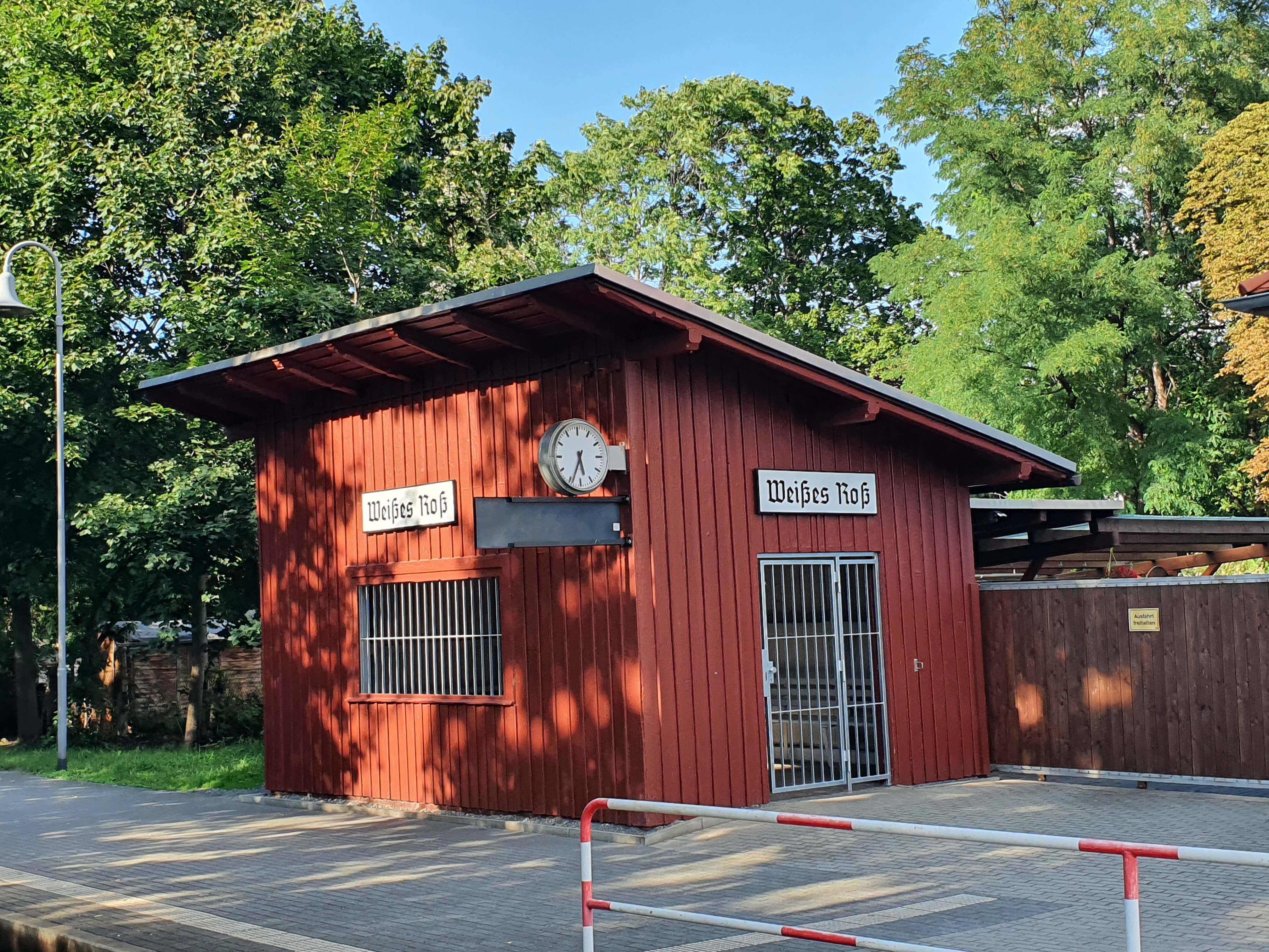 Die Lößnitzgrundbahn hält auch am kleinen Bahnhof Weißes Roß, direkt neben dem ehemaligen Gasthaus Weißes Roß, in dem Karl und Emma May manchmal speisten.