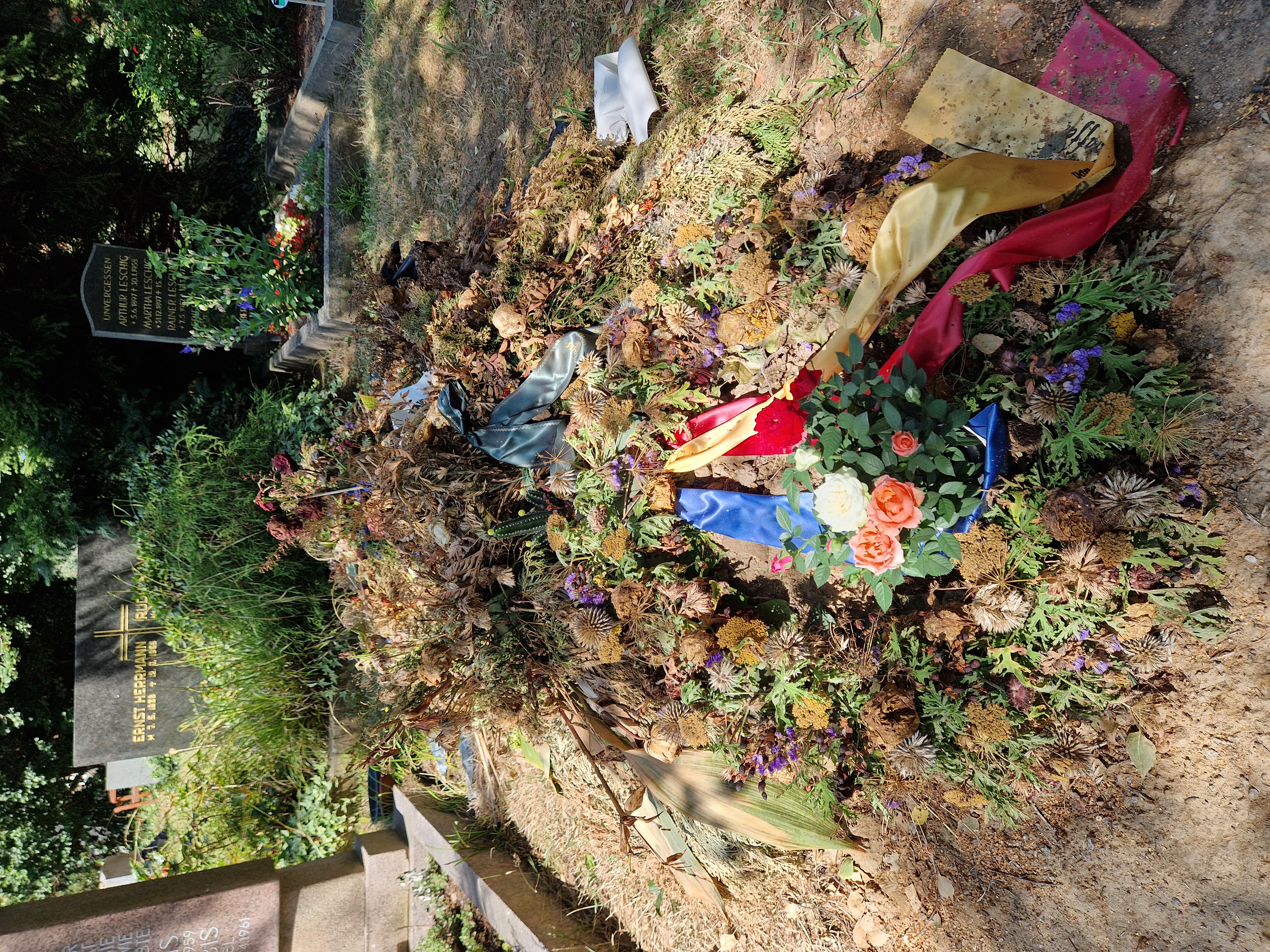 Radebeul, Friedhofstraße/ Serkowitzer Straße 33: Friedhof Radebeul Ost: Der Nachteil eines solchen provisorischen Grabes ist, dass bei der Beerdigung viele Blumen und Kränze darauf abgelegt werden, die innerhalb eines Monats alle verwelkt sind. Deshalb hat sich René Wagner (* 20. März 1950, 14. Juni 2024) eine frische Pflanze von Ihrem Webmaster verdient. © Foto 2024 |