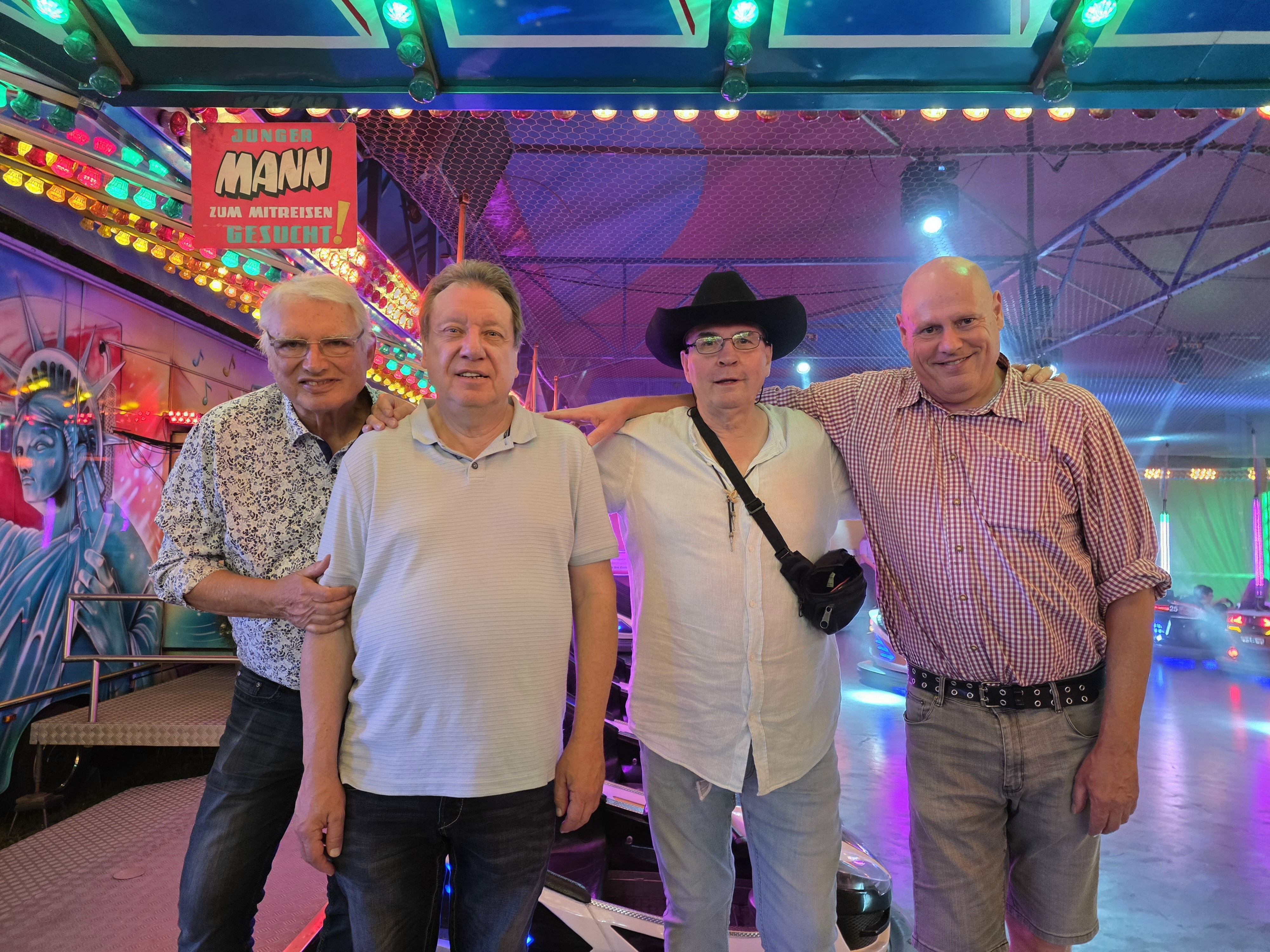 Hohenstein-Ernstthal, Birkensteig: De voorzitter en drie leden van de Silberbüchse - Förderverein Karl-May-Haus e.V. hebben de grootste lol op het Bergfest. V.l.n.r. aan: voorzitter Erich Homilius (* 30 oktober 1944), Ralf Harder (* 13 februari 1962), Rolf Müller (* 3 oktober 1960) en Roger Schenk (* 1 februari 1964). © foto 2025 |