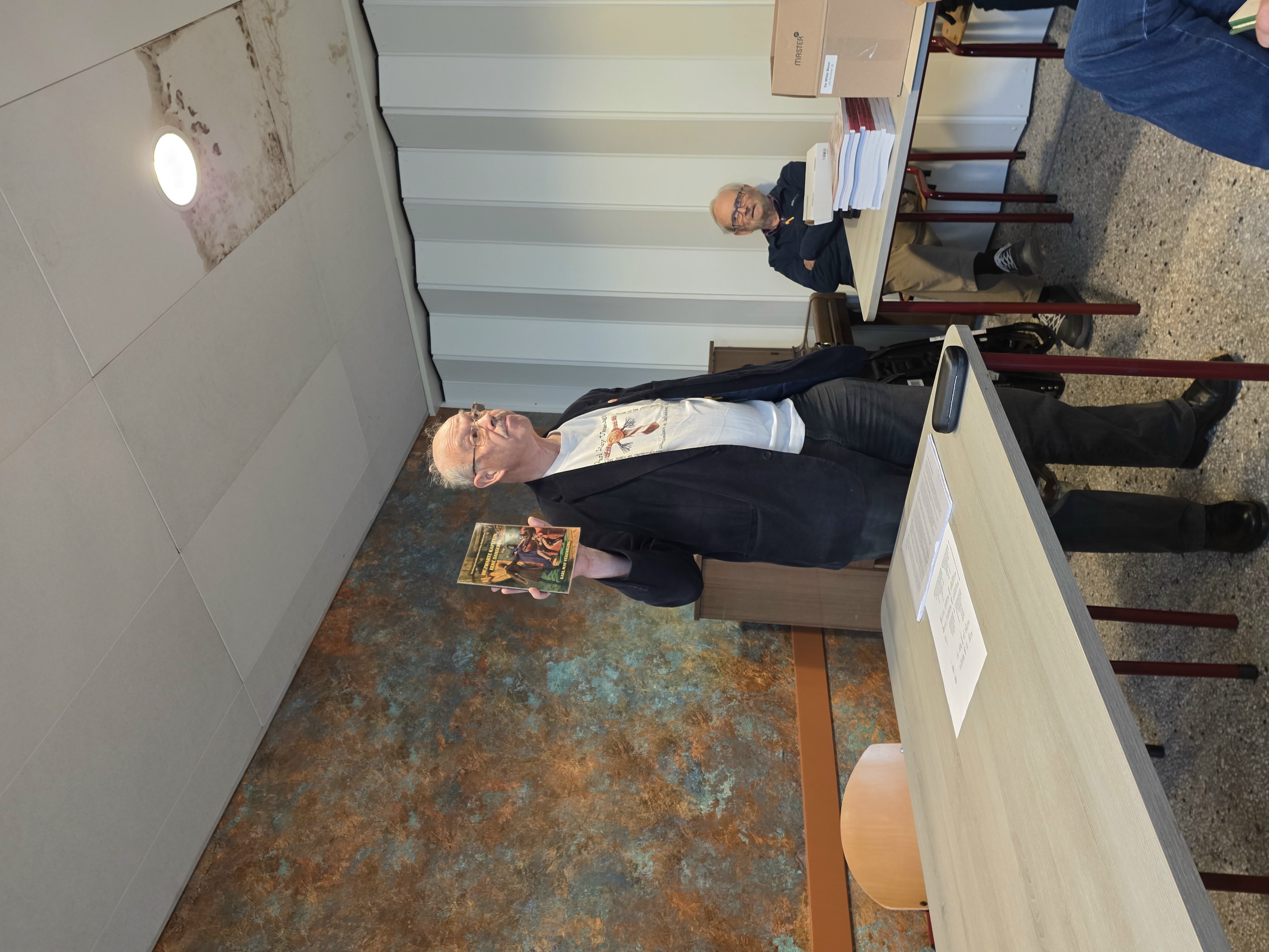 Amersfoort, Vogelplein 1: De Bron: Voorzitter Jan Willem van der Jagt (* ?) presenteert de vijfde eigen uitgave van de Karl-May-Vereniging: een pocket waarin zich twee door hem voor het eerst in het Nederlands vertaalde episodes uit de »Waldröschen«-roman bevinden. © foto 2025 |