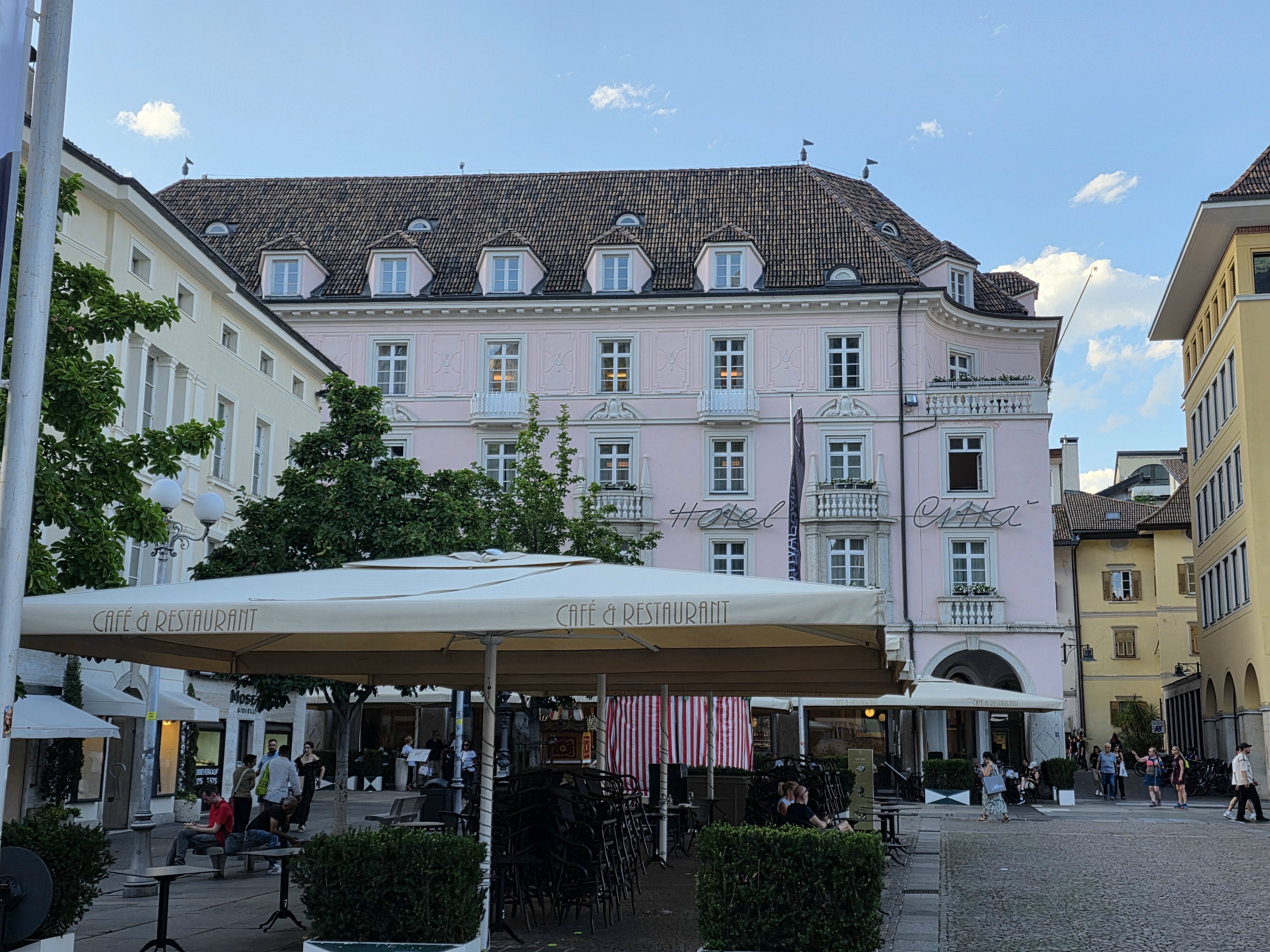Bozen (Bolzano), Waltherplatz/ Piazza Walther: Toen Karl May en zijn geliefde Klara zijn wettige echtgenote Emma zo schandalig hadden achtergelaten op de Mendelpas, verdween Emma al snel. Omdat hij enkele dingen met haar te regelen had, probeerde hij haar verblijfplaats te achterhalen en zo kwam hij op 12 oktober 1902, op reis naar het Gardameer in Bozen/Bolzano, waar hij zijn intrek nam in Hotel Walther von der Vogelweide. © foto 2025 |