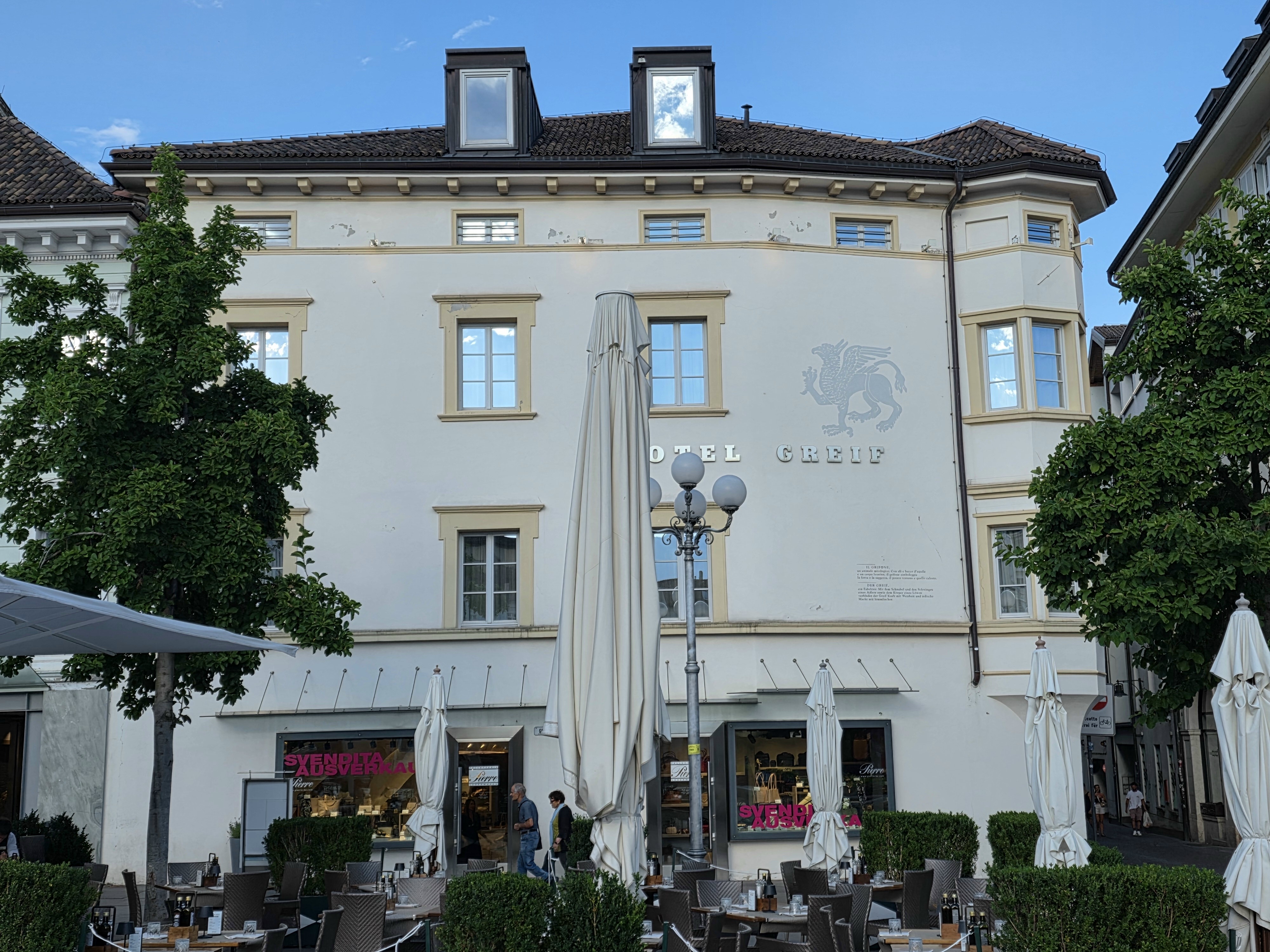 Bozen (Bolzano), Waltherplatz/ Piazza Walther: Intussen had Emma een kamer gehuurd in Hotel zum schwarzen Greifen. Dat hotel bestaat nog steeds, maar heet nu Hotel Greif; ook dit zeer dure hotel ligt aan de Waltherplatz/Piazza Walther. Daar bezocht Karl May op de avond van 12 oktober 1902 zijn op dat moment nog steeds rechtmatige vrouw en wees haar ruw af. © foto 2025  |
