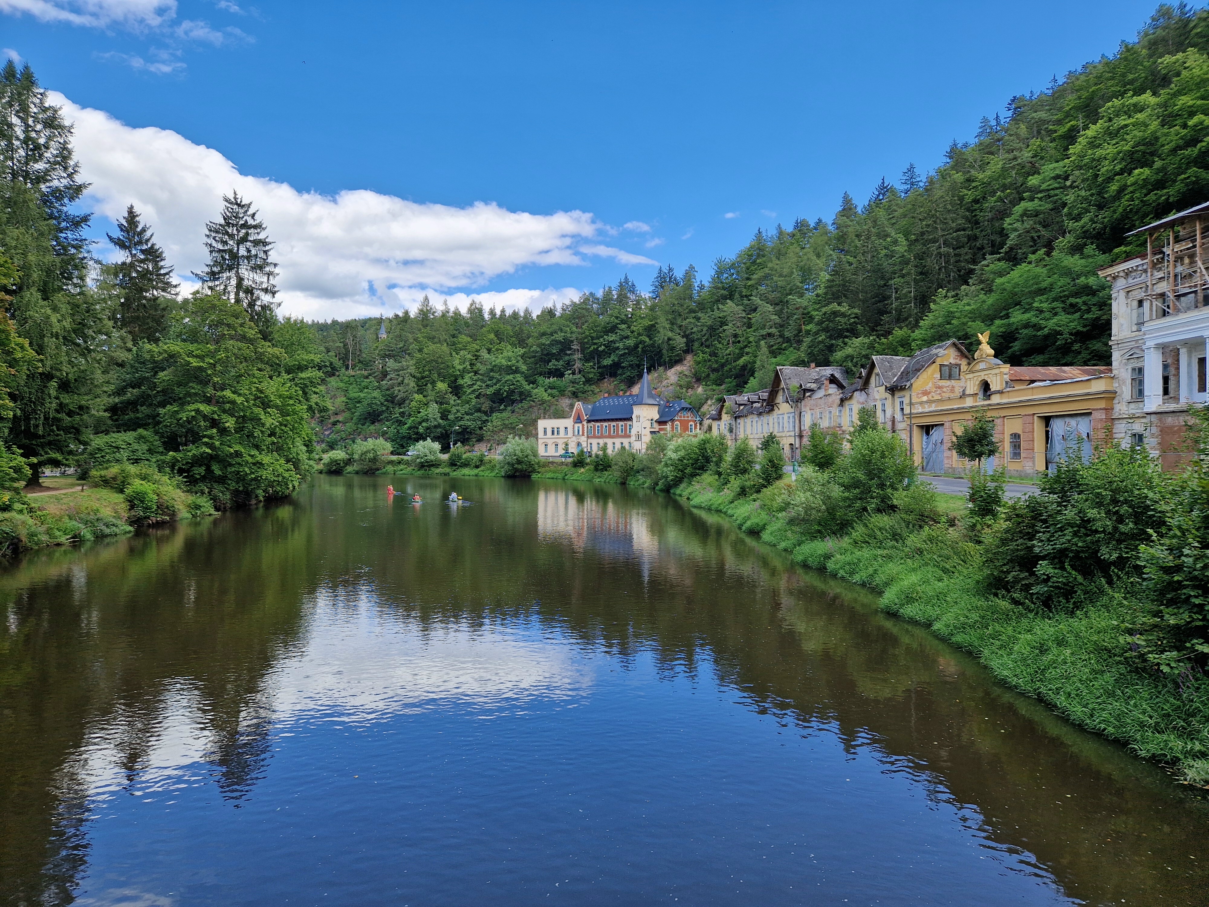 Blik op de Eger (Ohře). Hoe mooi moet het hier zijn geweest tijdens het bezoek van Karl en Klara May op 21 mei 1911, toen alle gebouwen nog in volle glorie straalden! Binnenkort weer?