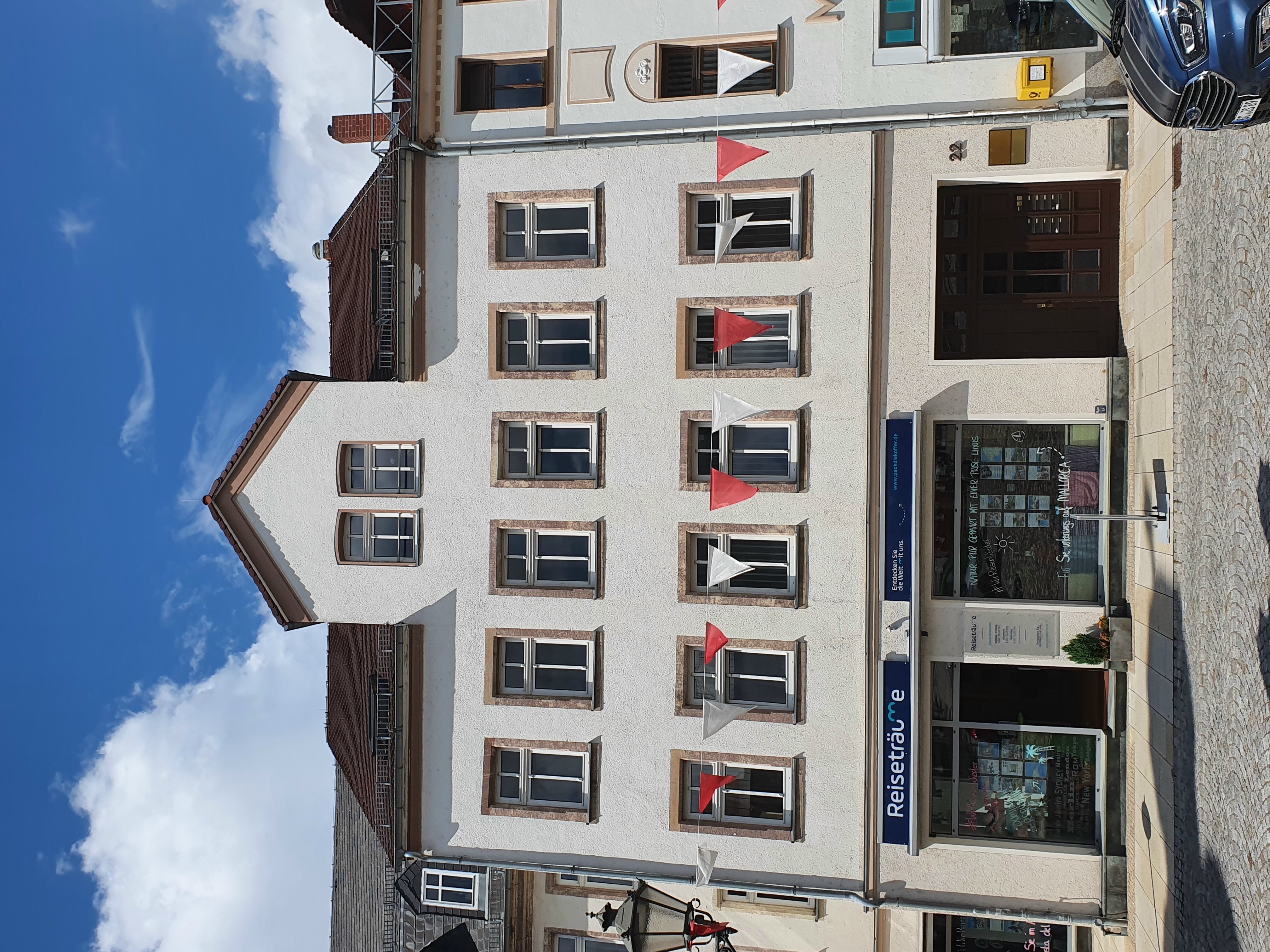 Glauchau, Markt 22: Op 15 juni 1869 stuurde Karl May bakker Christian Anton Wappler (* 1816,  1879) en diens drie zonen uit Mülsen St. Jakob naar Dingelstedts Hotel op de Markt 22 te Glauchau, waar een Dr. Schaffrath, advocaat uit Dresden, nadere details omtrent een onverwachte erfenis uit Amerika met de verbouwereerde bakker zou bespreken. Nu de mannen uit huis waren, had May de handen vrij om als geheime agent van politie de vrouw des huizes 28 daalders aan valsgeld afhandig te maken. Dingelstedts Hotel is na deze tijd diverse malen van eigenaar en functie veranderd: nu dient het als reisbureau en woonhuis. © foto 2021  |
