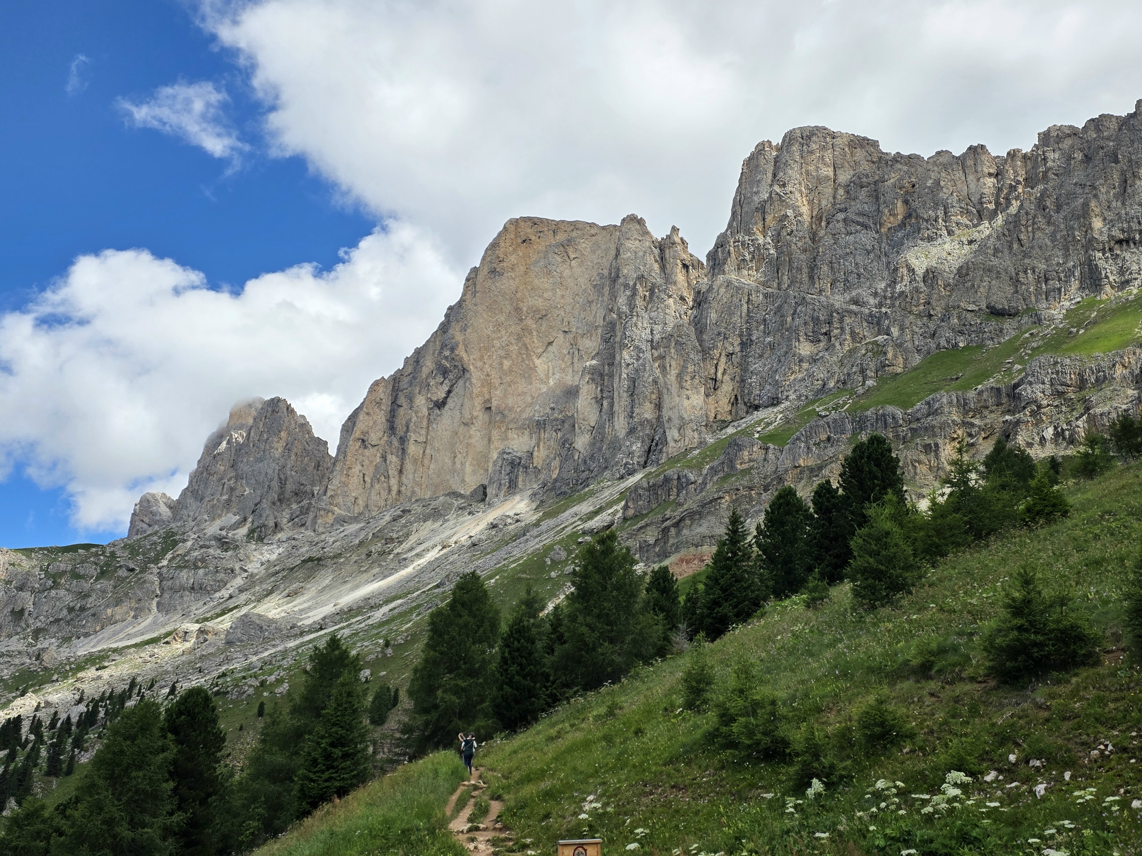 Karersee (Carezza al Lago): Hoog boven het dorp ligt de Rotwand (Italiaans: Roda di Vaèl), een bergketen als onderdeel van de Rosengarten (Italiaans: Catinaccio). De Rosengarten is een berggroepin de Dolomieten en is sinds 1974 onderdeel van het Naturpark Schlern-Rosengarten (Parco naturale dello Sciliar-Catinaccio); de Rosengarten wordt ook door Klara May-Beibler genoemd in haar dagboek, maar haar topografie is blijkbaar net zo slecht als haar karakter: ze noemt op 11 juli 1911 - toen Karl May net min of meer hersteld was van zijn radiumkuur in St. Joachimsthal (Jáchmyov) - een verblijf in Madonna di Campiglio en de Brentagroep (een bergketen vlakbij dat Madonna di Campiglio) en de Rotwand in één adem; tussen beide bergketens liggen 104 kilometer. Op 20 juli reizen ze naar Bozen/Bolzano en een dag later door het Eggental (Klara spelde Eggethal; Italiaans: Val dEga) naar de Karerseepass (Italiaans: Passo Costalunga) en vandaar dan inderdaad naar de Rosengarten, waar Klara enkele fotos maakte van Karl May met de twee hondjes Engelchen en Seelchen. Door het Eggental loopt tegenwoordig de SS241, hetgeen de duur van de reis van Bozen/Bolzano naar Karersee (Carezza al Lago) terugbrengt tot drie kwartiertjes. © foto 2025 |