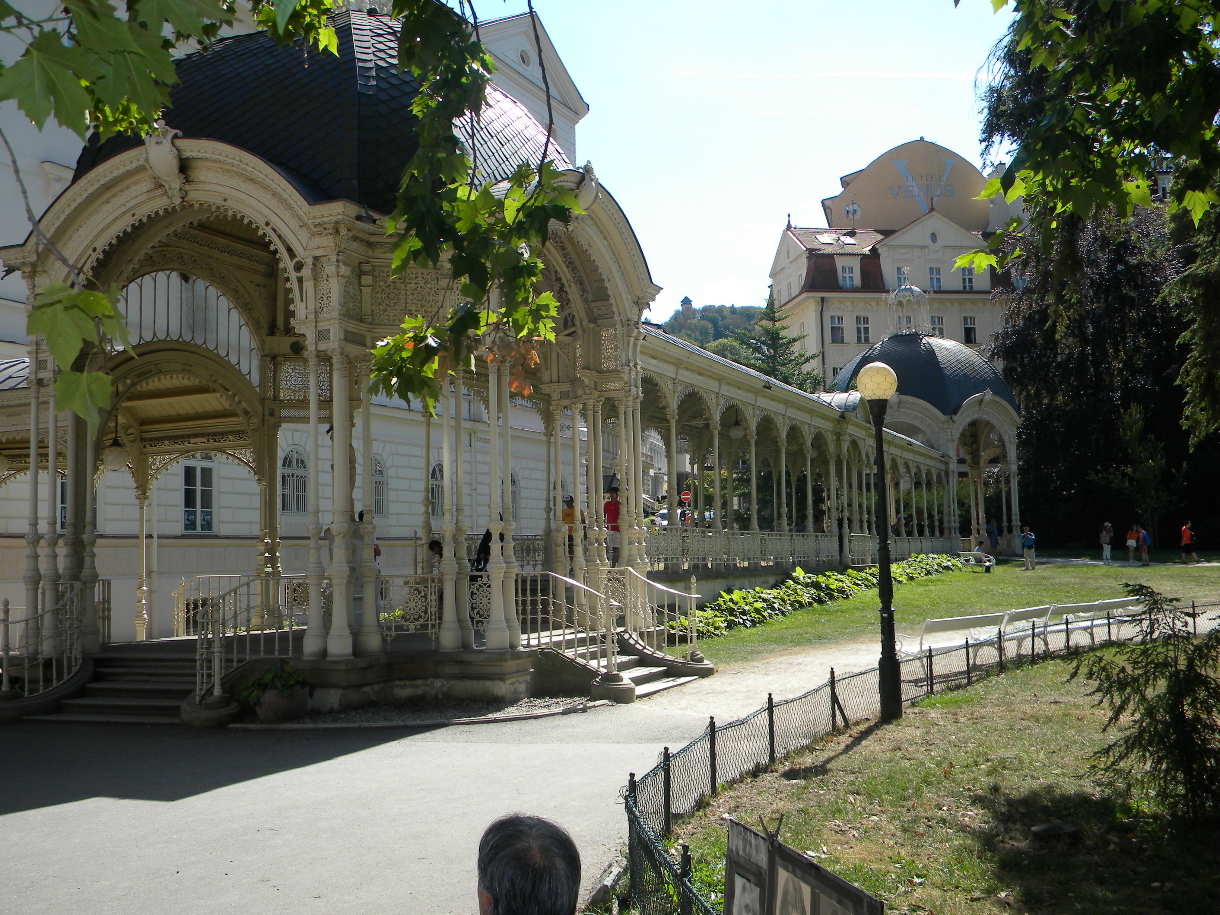 Karlsbad (Karlovy Vary), Zaradní: En als ze dan door dat park zijn gewandeld, moeten ze vroeg of laat bij deze mooie gietijzeren Parkkolonnade uit 1880 zijn gekomen. De Tsjechische naam Sadová kolonáda herinnert aan de door de Duitse Bond o.l.v. Oostenrijk verloren slag tegen Pruisen op 3 juli 1866: de Slag bij Sadová, ook wel Slag bij Königgrätz genoemd. © foto 2018 |