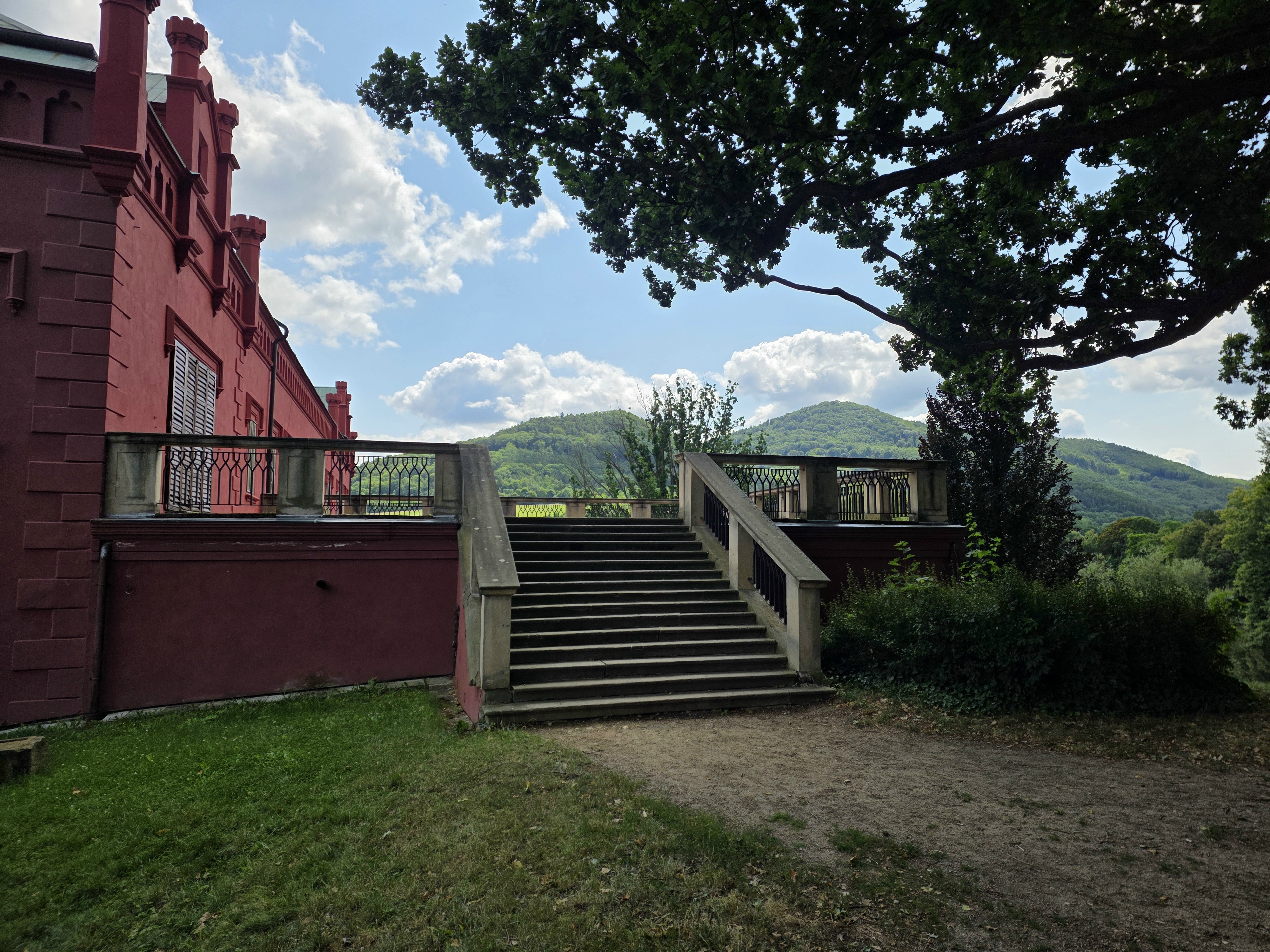 Klösterle an der Eger (Klášterec nad Ohří): Er bestaan twee fotos van Karl May met de hondjes Seelchen en Engelchen, op deze trap naar het terras naast het slot. Ze lijken niet door Klara May, die toch zo dol op fotografen was, te zijn gemaakt. In combinatie met het gegeven dat zij vorst Franz von Thun und Hohenstein (voluit: Franz Anton von Thun und Hohenstein, * 2 september 1847, 1 november 1916; van maart 1889 tot 1896 en van 1911 tot maart 1915 keizerlijk gouverneur van Bohemen en van maart 1898 tot oktober 1899 minister-president van Cisleithanië), bij wie Karl May op bezoek wilde, niet vermeldt, terwijl ze anders toch altijd alle hooggeplaatste personen met wie Karl in contact kwam nauwkeurig noemde plus het feit dat zij normaliter geen seconde van Mays zijde week, moeten wij concluderen dat deze twee fotos gemaakt zijn op maandag 12 juni 1911: omdat Klara May het in haar hoofd had gehaald om samen met de nauwelijks herstelde Karl May naar Hotel Penegal op de Mendelpas te rijden, ging zij op die datum met hun dienstmeisje naar Radebeul om meer kleding te halen. © foto 2025 |