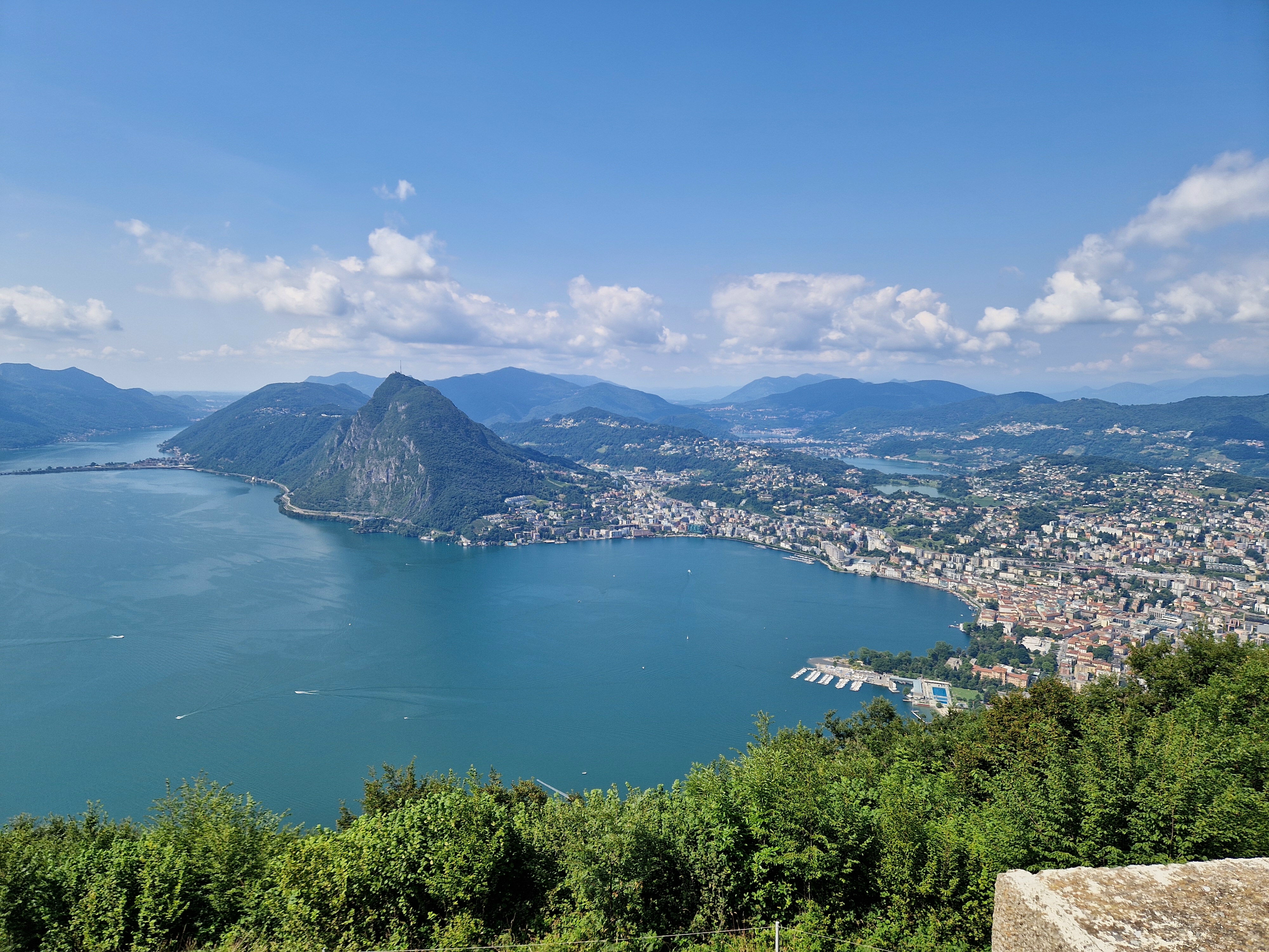 Lugano, Monte Brè: Tegenwoordig duurt de treinreis van Freiburg i.Br. naar Lugano volgens Google Maps iets meer dan vier uur. Ervan uitgaande dat het eind negentiende eeuw allemaal iets langzamer ging, zullen de bevriende paren May en Plöhn in de loop van de middag in Lugano zijn gearriveerd. Op Eerste Paasdag, 2 april 1899, ging de reis alweer verder, nu naar Genua. Voor het bezoek aan Lugano blijft dus hooguit 1½ dag over. Alleen het bezoek aan de hier afgebeelde Monte San Salvatore, een van de twee bergen die Lugano omsluiten, is gedocumenteerd middels Karl Mays gedicht »San Salvatore«. Het is niet onwaarschijnlijk dat ze een boottochtje op de het mooie Meer van Lugano maakten en eventueel ook die andere berg, de Monte Brè bezochten, vanwaar ze in ieder geval dit weergaloze uitzicht op het meer en de Monte San Salvatore hadden. © foto 2025 |
