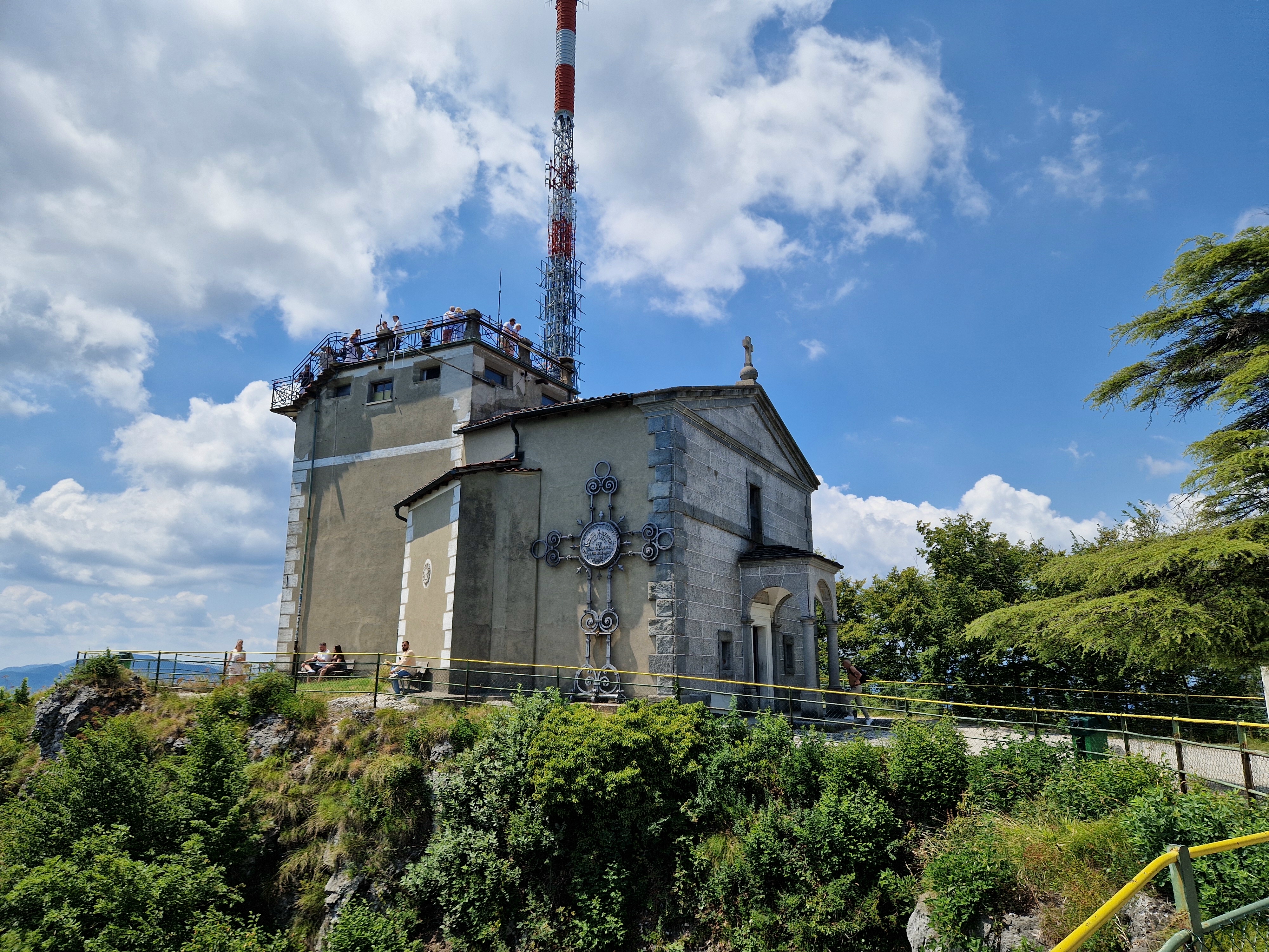 Lugano, Monte San Salvatore: Op de Monte San Salvatore staat de beroemde kapel San Salvatoria ✞, die Karl May bezocht en die hem inspireerde tot het gedicht »San Salvatore«. Het bijzondere van de kapel is dat men op het dak ervan kan staan voor een nog mooier panorama over het meer en de omringende bergen. © foto 2025 |