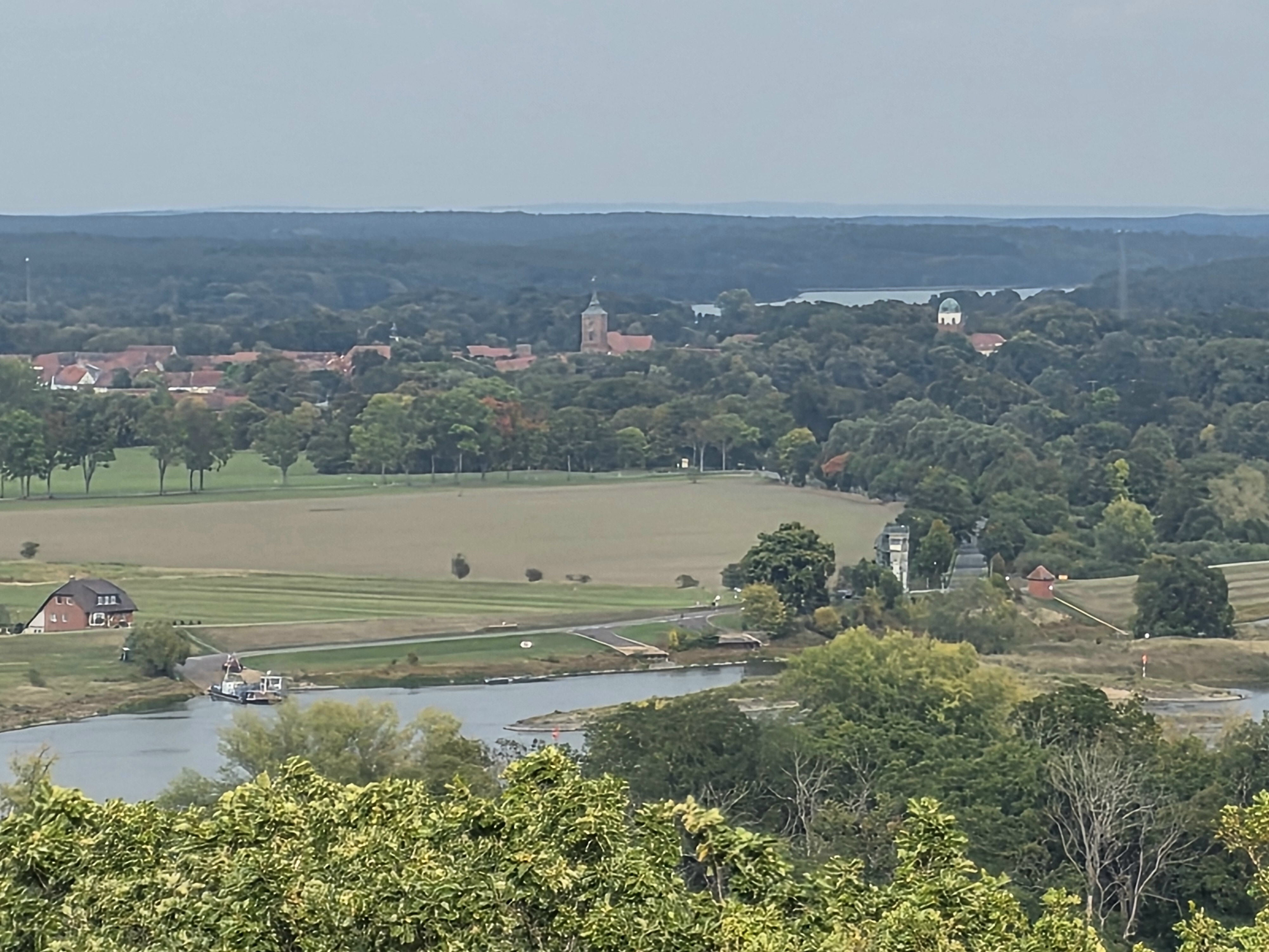 Pevestorf, Aussichtsturm Schwedenschanze: Blik op het dorp Lenzen in Brandenburg (Pruisen), waar Karl May op die 30e april 1898 vandaan kwam. Grensformaliteiten waren er niet, want het Koninkrijk Hannover, waarin Pevestorf en Gartow lagen, was op 20 september 1866 door Pruisen geannexeerd. © foto 2025 |