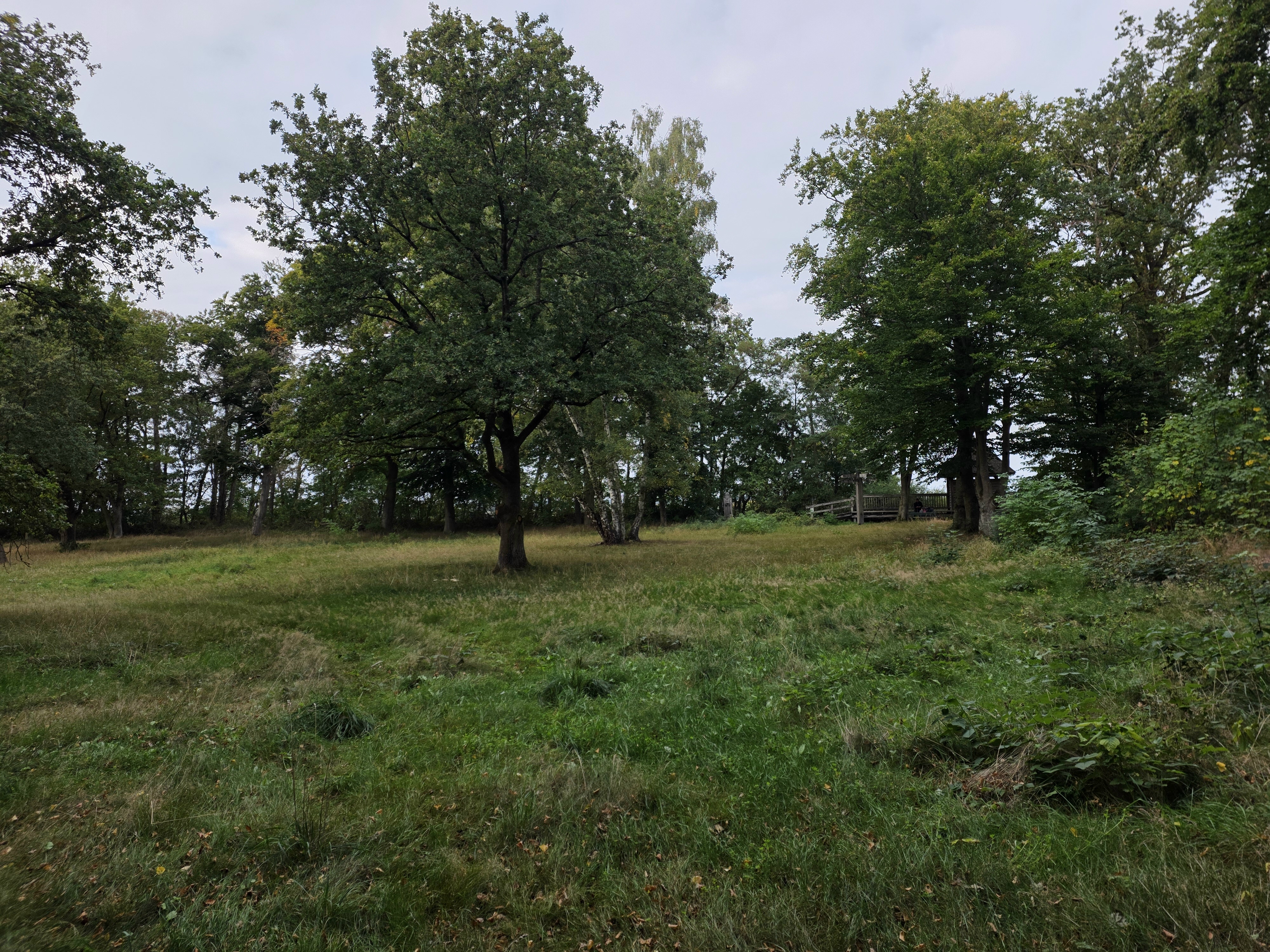 Pevestorf, Vietzer Schanze: Honderd meter ten westen van de (restanten van de) voormalige Thalmühle bevond zich op een vlakte in het bos, net boven de Elbe, het castellum huobuoki, een verdedigingsfort van Karel de Grote (* 2 april 747 of 748 (?), 28 januari 814; koning van het Frankische Rijk van 24 september 768 tot 28 januari 814 en keizer van het Roomse Rijk van 25 december 800 tot 28 januari 814). Eén jaar voordat Karl May in deze omgeving verbleef, was professor Carl Schuchhardt (* 6 augustus 1859, 7 december 1943; hoogleraar te Berlijn en directeur van het Kestner-Museum in Hannover) begonnen met het opgraven ervan; volgens Gerhard Klußmeier (* 14 mei 1939) en Kerstin Beck (»Sitz im Hotel ich weltverloren ... Karl Mays Reise 1898 nach Gartow, Kapern, Lenzen, Lanz und Schnackenburg ...», p. 34) heeft Karl May tijdens zijn verblijf in Pevestorf of Gartow zeker van de gelegenheid gebruik gemaakt om deze opgraving te bezoeken. © foto 2025 |