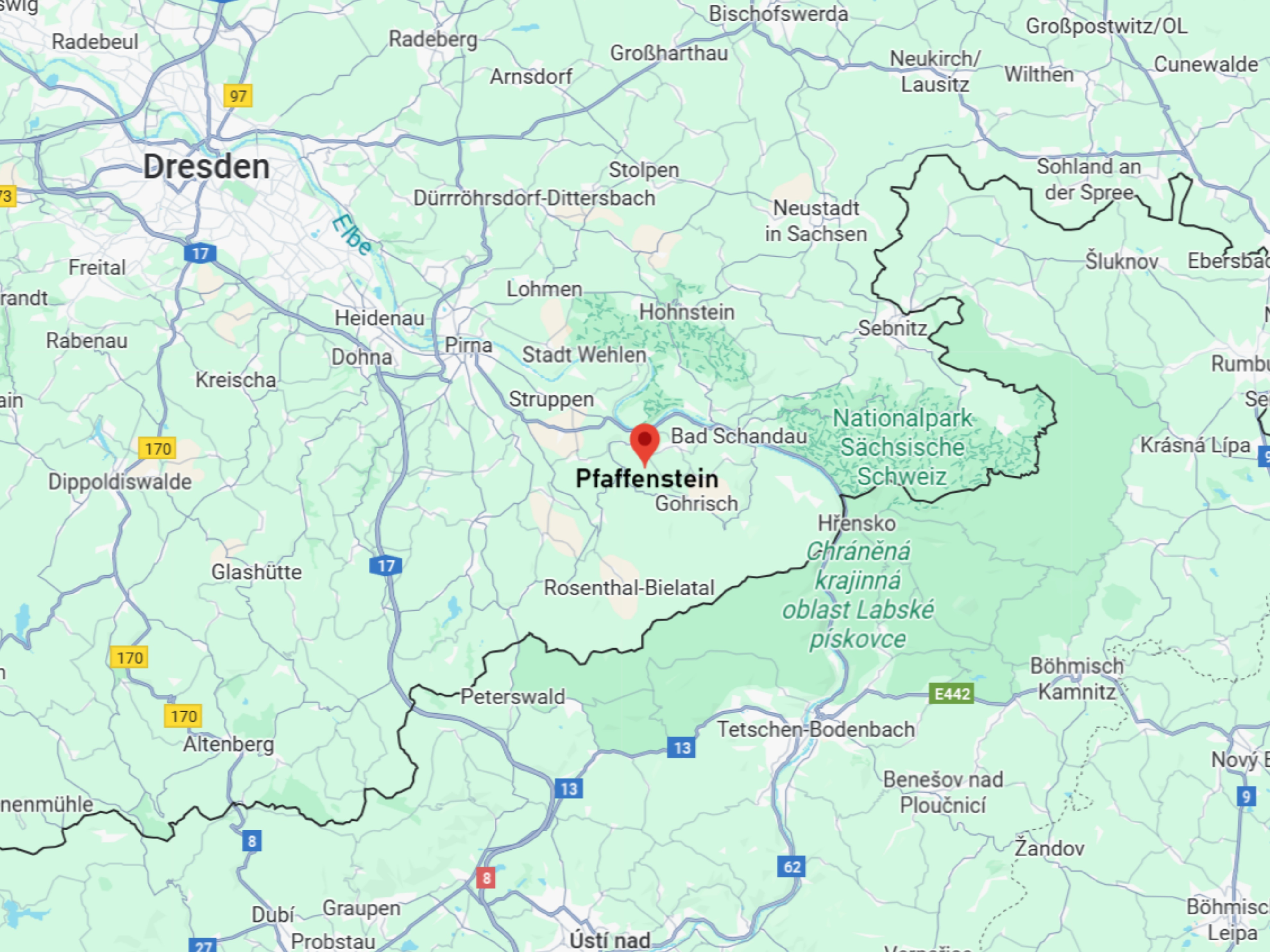 Pfaffenstein: ![]() De Pfaffenstein is een 434 meter hoge tafelberg in het Elbsandsteingebirge in Saksen, op de linker oever van de Elbe. De tafelberg was in het verleden vanwege de nogal slechte bereikbaarheid een geliefd toevluchtsoord in tijden van crisis: er zijn sporen van bewoning uit de steen- en bronstijd aangetroffen, net als op andere heuveltoppen in de Sächsische Schweiz. Vanaf het einde van de negentiende eeuw wordt de heuvel voor toeristische doeleinden gebruikt: op de min of meer platte top (± 1000 bij 400 meter) verrezen een restaurant, een uitkijktoren en verscheidene uitkijkpunten en andere bezienswaardigheden. Maar liefst 32 rotsen van de Pfaffenstein kunnen beklommen worden; dat waren er ooit 33, maar sinds 1975 is het vanwege erosie niet meer toegestaan de vrijstaande Barbarine, een rotsnaald van 43 meter hoog die wel het symbool van de Sächsische Schweiz is geworden, te beklimmen. |