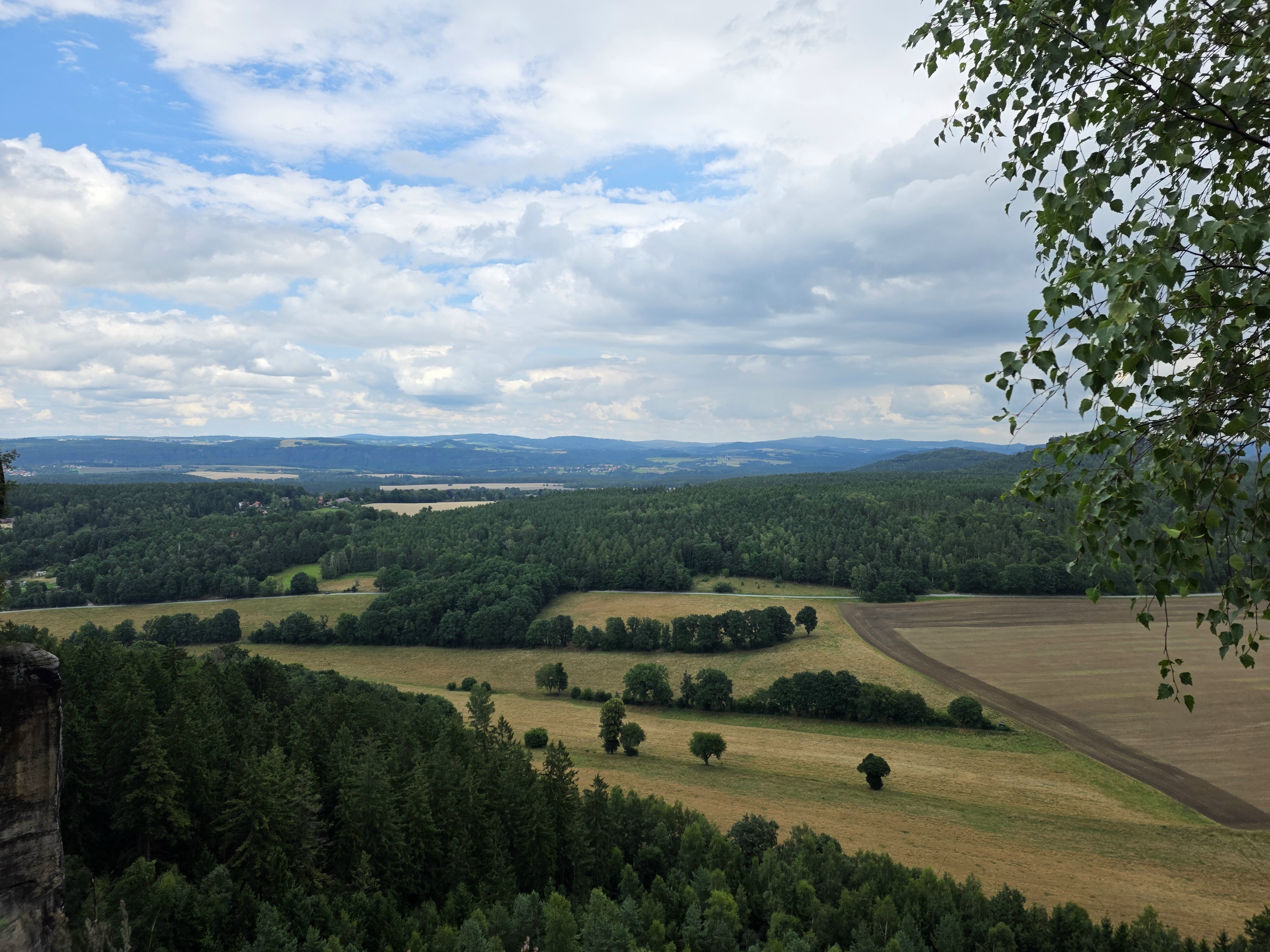 Pfaffenstein: Wie zich eenmaal door de smalle doorgangen heeft gewrongen, wordt beloond met dit prachtige uitzicht. Dat overkwam ook Karl May, die op 9 juli 1901 deze Pfaffenstein bedwong, zoals we weten uit een ansichtkaart met gedicht dat hij van hier stuurde aan Wilhelmine Beibler, de moeder van zijn latere tweede vrouw. © foto 2025 |