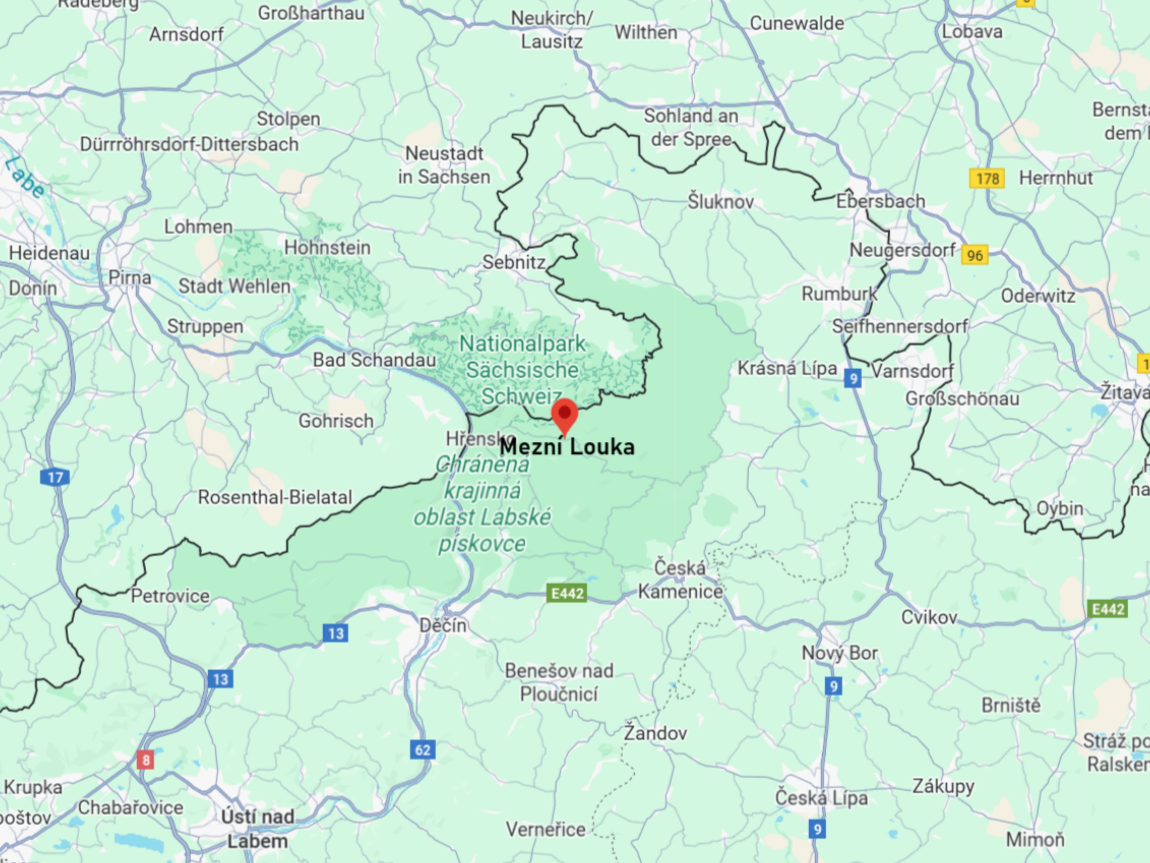 Rainwiese: ![]() Rainwiese (in het Tsjechisch Mezní Louka genaamd) ligt op een plateau even ten zuiden van de grens tussen Duitsland en Tsjechië; de nederzetting ligt in het Nationalpark Böhmische Schweiz (Národní park České Švýcarsko) op een hoogte van 270 meter boven zeeniveau. In 1794 werd een boswachterswoning gebouwd, waarin in 1838 een eenvoudige herberg werd gevestigd, waarna het toerisme voorzichtig op gang kwam. In 1892 kwam daar een luxehotel bij. Mezní Louka is de uitvalsbasis voor wandelingen naar de Edmundsklamm (Edmundova Soutěska) en het Prebischtor (Pravčická brána). Mezní Louka behoort tot het kadastrale gebied Mezná u Hřensko (Stimmersdorf), onderdeel van de gemeente Hřensko (Herrnskretschen); in heel Hřensko woonden op 31 december 2024 maar liefst 247 mensen; slechts een fractie daarvan woont permanent in Mezní Louka. |