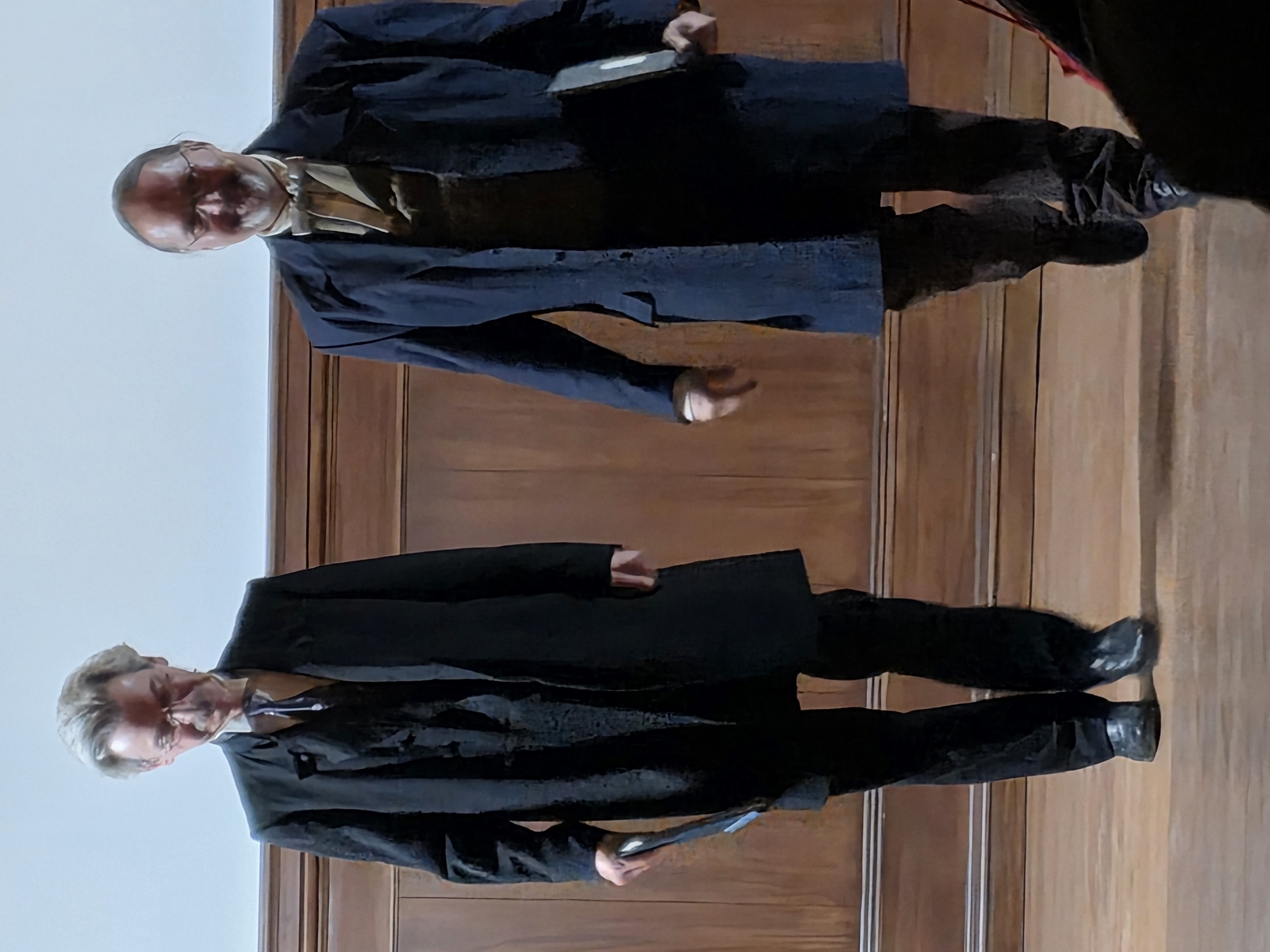 Rostock, Universitätsplatz 1: Universität Rostock: Het avondprogramma van de eerste dag van het congres (2 oktober 2025) werd verzorgd door Robby Langer (* 1961) en Roland Wichmann (* 1968), die een theaterstukje maakten van de correspondentie tussen Karl May en Sascha Schneider (voluit: Rudolph Karl Alexander Schneider, * 21 september 1870, 18 augustus 1927). Beide heren verdienden en kregen een daverend applaus. © foto 2025 |