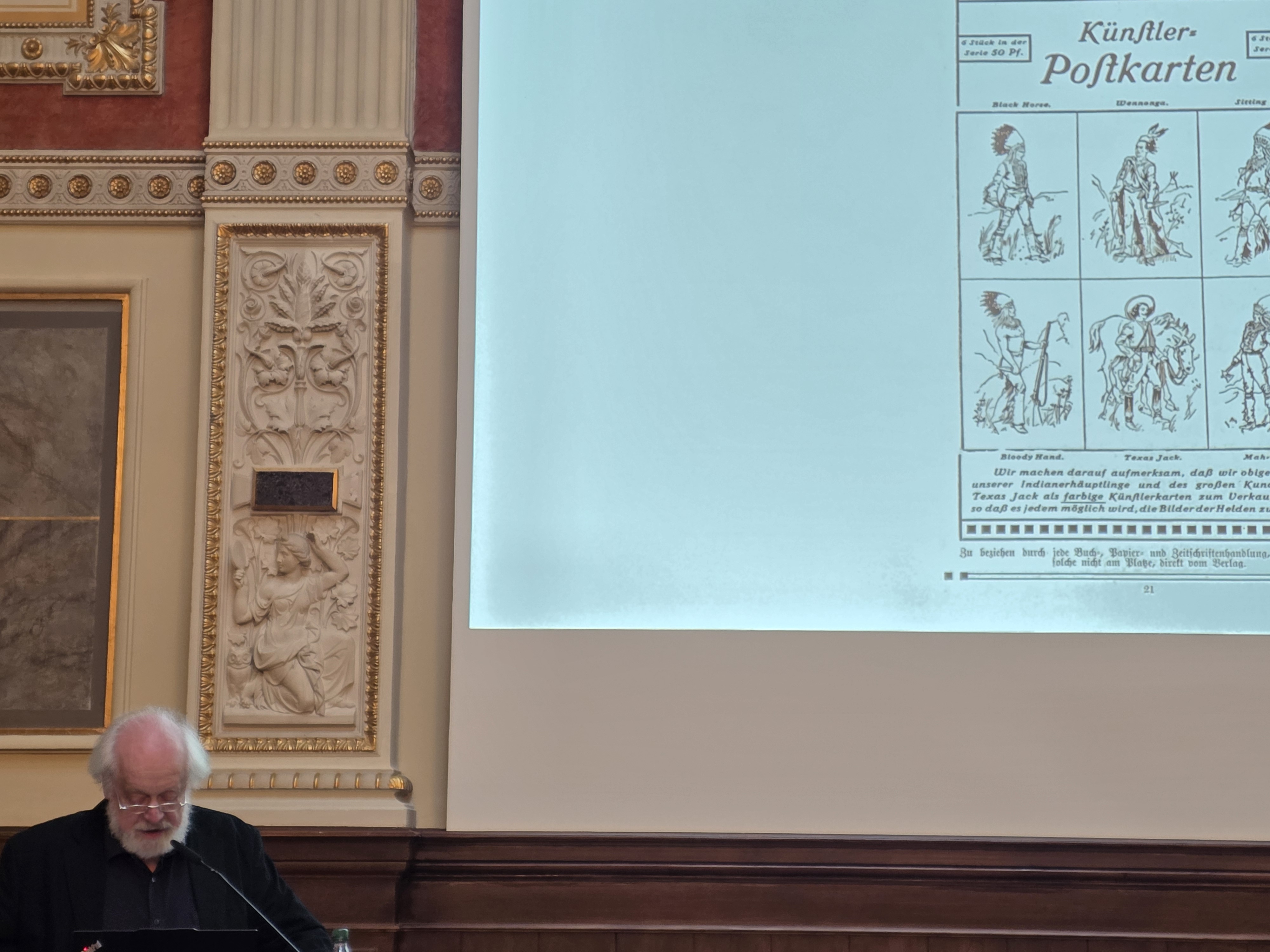 Rostock, Universitätsplatz 1: Universität Rostock: Dr. Wolfgang Griep (* 1948) besprak het thema Der edle Häuptling Winoga und andere Helden. Das Berliner Verlagshaus für Volksliteratur und Kunst. Van de driestuiversroman Winoga, der letzte Mohikaner verschenen tussen 1921 en 1924 maar liefst 90 afleveringen. De titel doet al vermoeden dat het om een kruising tussen Winnetou en Last of the Mohicans gaat. © foto 2025 |