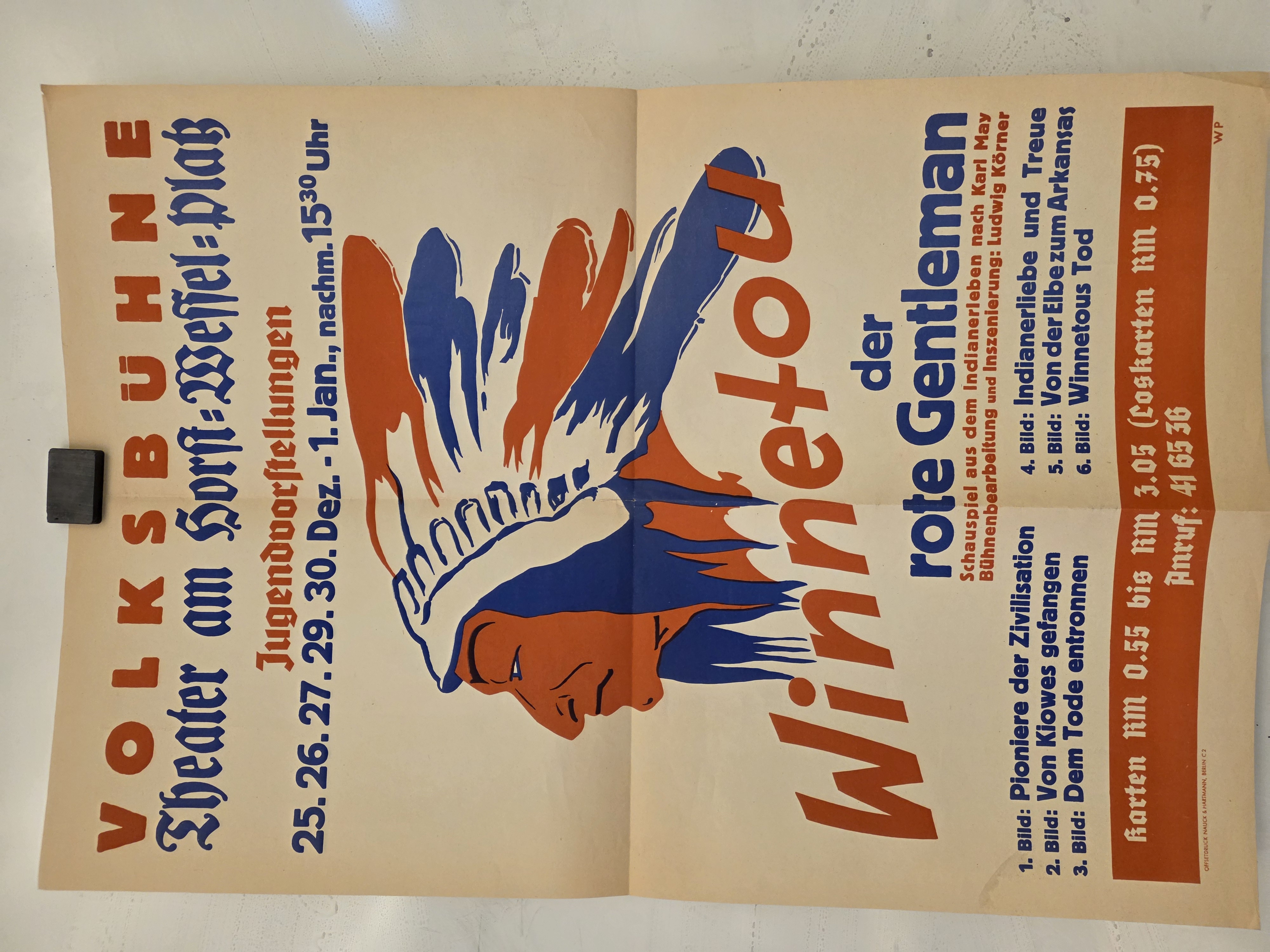Rostock, Universitätsplatz 1: Universität Rostock: Op de traditionele veiling op 3 oktober 2025 in Hoorzaal 218 was o.a. deze originele poster uit 1938 van het toneelstuk »Winnetou, der rote Gentleman«, bewerkt door Ludwig Körner (* 22 december 1890, 2 maart 1968), te koop. Gelukkig nog een beetje cultureel vertier op het plein in Berlijn dat tussen 1933 en 1945 naar de uiterst aculturele en ongezellige Horst Wessel (voluit: Horst Ludwig Georg Erich Wessel, 9 oktober 1907, 23 februari 1930) was benoemd; na 1945 werd de huidige naam, Rosa-Luxemburg-Platz, aangenomen. Het Theater am Horst-Wessel-Platz bestaat nog steeds en heet weer gewoon Volksbühne. De poster is op de veiling gekocht door pastoor Willi Stroband (* 9 januari 1958): proficiat, Willi! © foto 2025 |