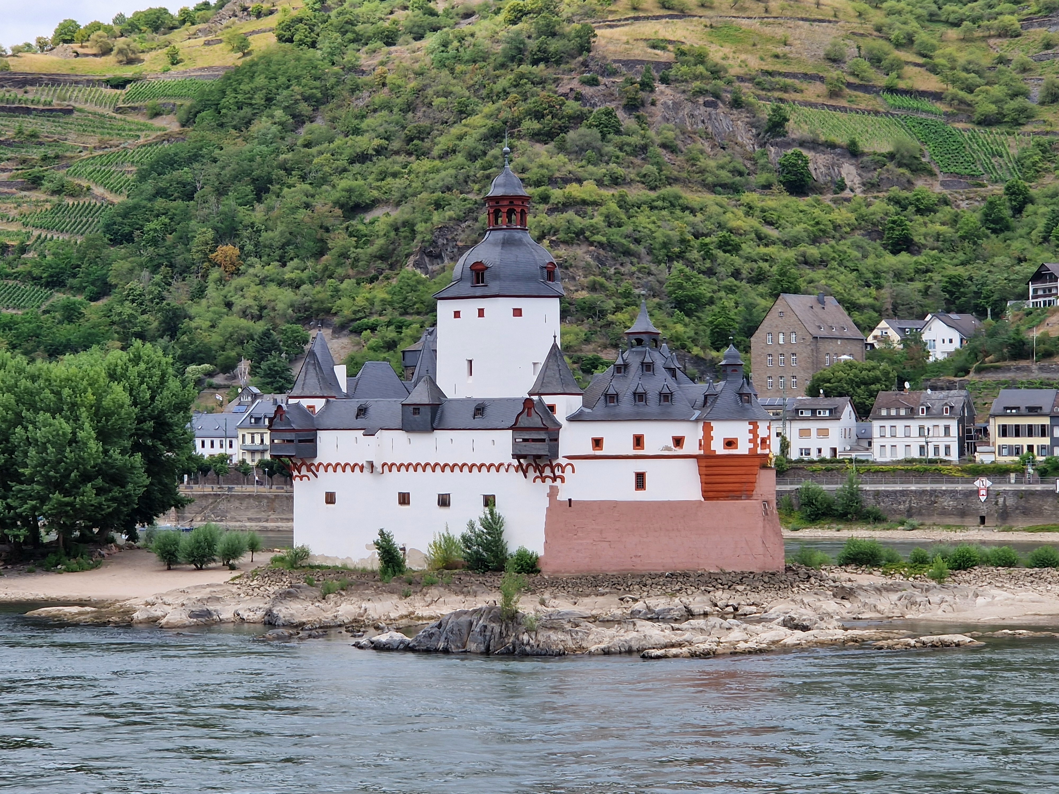Bacharach, Bundesstraße 9: De overtocht van Veldmaarschalk Gebhard Leberecht von Blücher (bijgenaamd Marschall Vorwärts, sinds 1814 Fürst Blücher von Wahlstatt, * 16 december 1742, 12 september 1819) van Kaub naar Bacharach werd mogelijk gemaakt door Russische pontoniers die op oudejaarsavond 1813 hadden pontonbrug aangelegd die voor de Fransen aan de linker oever van de Rijn lang onzichtbaar bleef dankzij de burcht Pfalzgrafenstein op het eilandje in de rivier. Blücher startte zijn overtocht exact om 12u op 1 januari 1814; verdere Silezische en Russische troepen volgden hem tussen 1 en 5 januari. Een model van zon ponton is te zien het Blücher-Museum in Kaub. © foto 2025 |