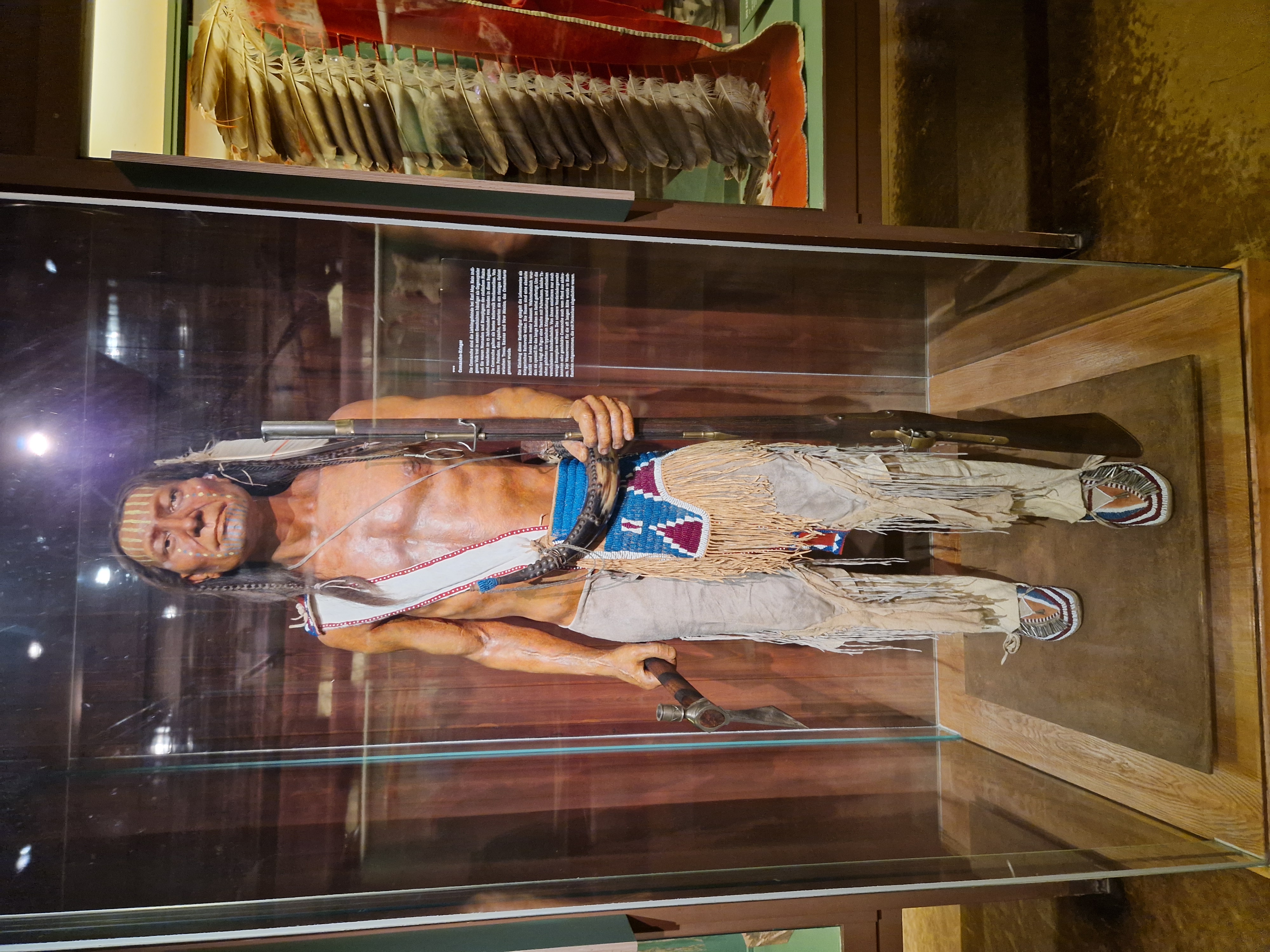 Radebeul, Karl-May-Straße 5: Villa Bärenfett: Permanente tentoonstelling: De krijger van de Neme-ne (Comanches), een figuur (1933) van Vittorio Güttner (* 24 april 1869, 5 december 1935) en Wilhelm Emil Elk Eber (* 18 april 1892, 12 augustus 1941), is na de restauratie een stuk minder kleurrijk geworden. © foto 2024 |