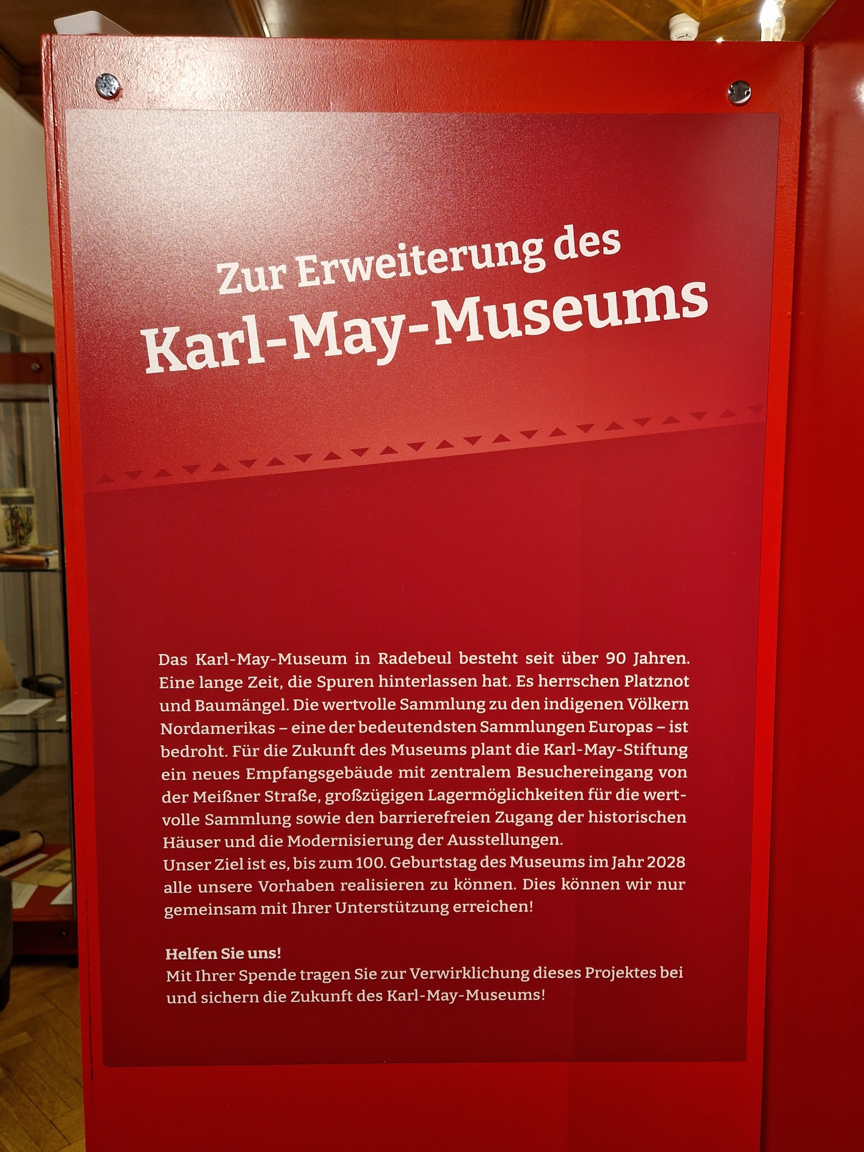 Radebeul, Karl-May-Straße 5: Villa Shatterhand: Oproep om een donatie te doen: Over de uitbreidng van het Karl-May-Museum Het Karl-May-Museum in Radebeul bestaat al meer dan 90 jaar. Een lange tijd, die sporen heeft achtergelaten. Er is een tekort aan ruimte en er zijn constructiefouten. De waardevolle collectie over de indianen van Noord-Amerika - een van de belangrijkste collecties van Europa - wordt bedreigd. Met het oog op de toekomst van het museum heeft de Karl-May-Stiftung plannen voor een nieuw ontvangstgebouw met een centrale bezoekersingang vanaf de Meißner Straße plus een barrièrevrije toegang tot de historische huizen en de modernisering van de tentoonstellingen. Het is ons doel om onze plannen voor de honderdste verjaardag van het museum in het jaar 2028 te kunnen realiseren. Dit kunnen wij alleen maar met uw steun bereiken! Help ons! Met uw donatie draagt u bij aan de realisatie van dit project en verzkert u de toekomst van het Karl-May-Museum! © foto 2023 |