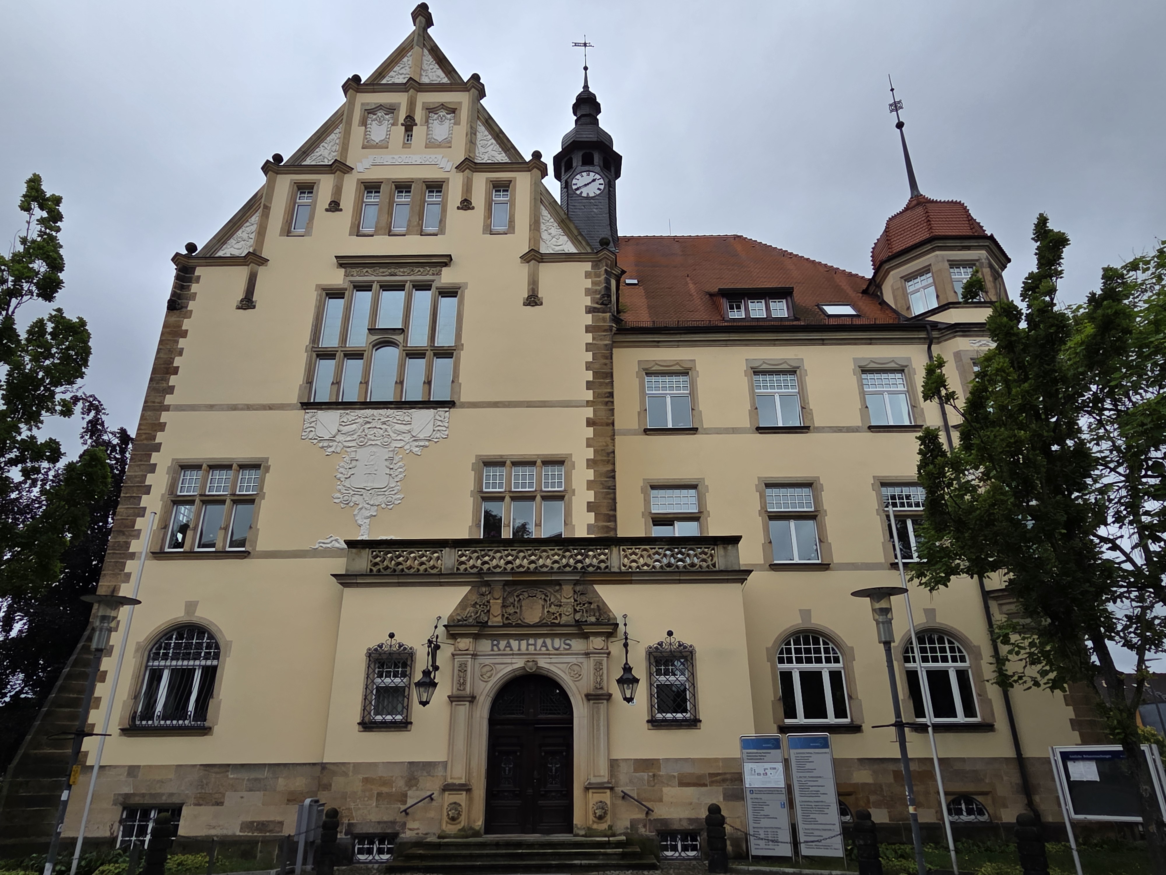 Radebeul, Pestalozzistraße 6: De achterkant van het stadhuis, waar Karl en Klara May op 30 maart 1903 voor de wet trouwden. Uiterst merkwaardig is Mays gedicht »Am Hochzeitstag« uit 1902 waarin hij voorspelde dat zijn huwelijksdag ook zijn sterfdag zou zijn; en inderdaad: op 30 maart 1903 trouwde hij voor de wet met deze Klara, op 30 maart 1912 overleed hij ... Bezat hij profetische gaven of bedoelde hij het op zijn herkenbare mystieke wijze, namelijk dat hij de dag waarop met Beibler trouwde, als de overlijdensdatum van de oude Karl May beschouwde? © foto 2025 |