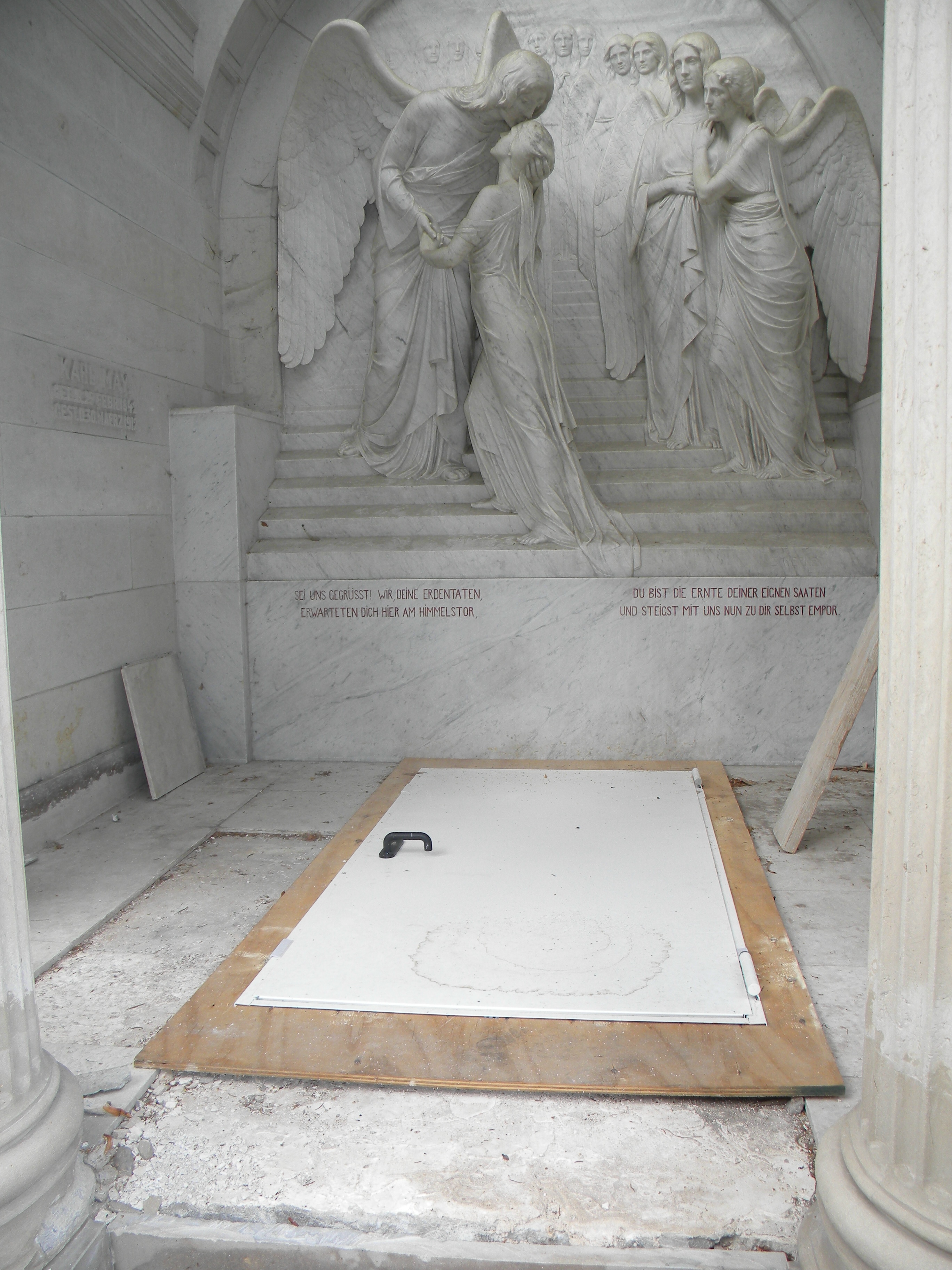 Radebeul, Friedhofstraße/ Serkowitzer Straße 33: Friedhof Radebeul Ost: In tegenstelling tot wat het bord op de vorige dia beweerde, is er wel degelijk iets te bezichtigen: de grafsteen is weg voor restauratie en de grafkelder wordt aan al te nieuwsgierige blikken onttrokken door een eenvoudige deur. © foto 2014 |