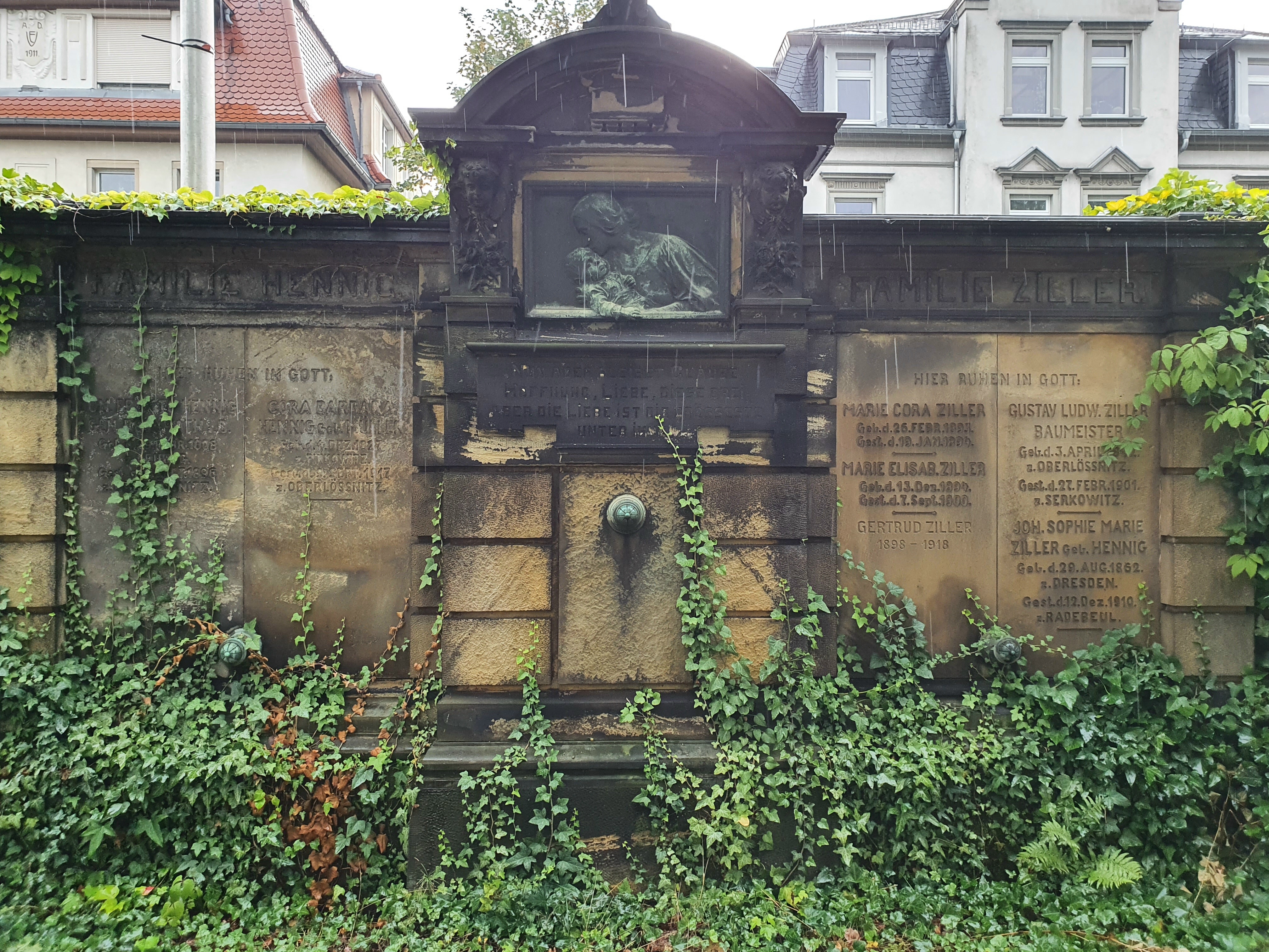 Radebeul, Friedhofstraße/ Serkowitzer Straße 33: Friedhof Radebeul Ost: Grafmonument van de families Hennig en Ziller. In dit graf ligt onder andere Gustav Ludwig Ziller (* 3 april 1842, 27 februari 1901), samen met zijn broer Moritz (voluit: Moritz Gustav Ferdinand Ziller, * 28 september 1838, 11 oktober 1895) de twee Gebroeders Ziller vormend, de bouwfirma die o.a. Villa Shatterhand bouwde. Hun broer Paul (voluit: Paul Friedrich Ziller, * 30 mei 1846; 11 maart 1931) was maar kort architect; in die paar maanden in 1901 slaagde hij er wel in om Richard Plöhns en Karl Mays graf op ditzelfde kerkhof te ontwerpen; een vierde broer, Ernst (voluit: Ernst Moritz Theodor Ziller, Grieks Ἐρνέστος Τσίλλερ, * 22 juni 1837, 4 november 1923), de oudste van het viertal, bouwde half Athene, o.a. het grafmonument van Heinrich Schliemann (voluit: Johann Ludwig Heinrich Julius Schliemann, * 6 januari 1822, 26 december 1890), dat als twee druppels water op dat van Plöhn en May lijkt. © foto 2020 |