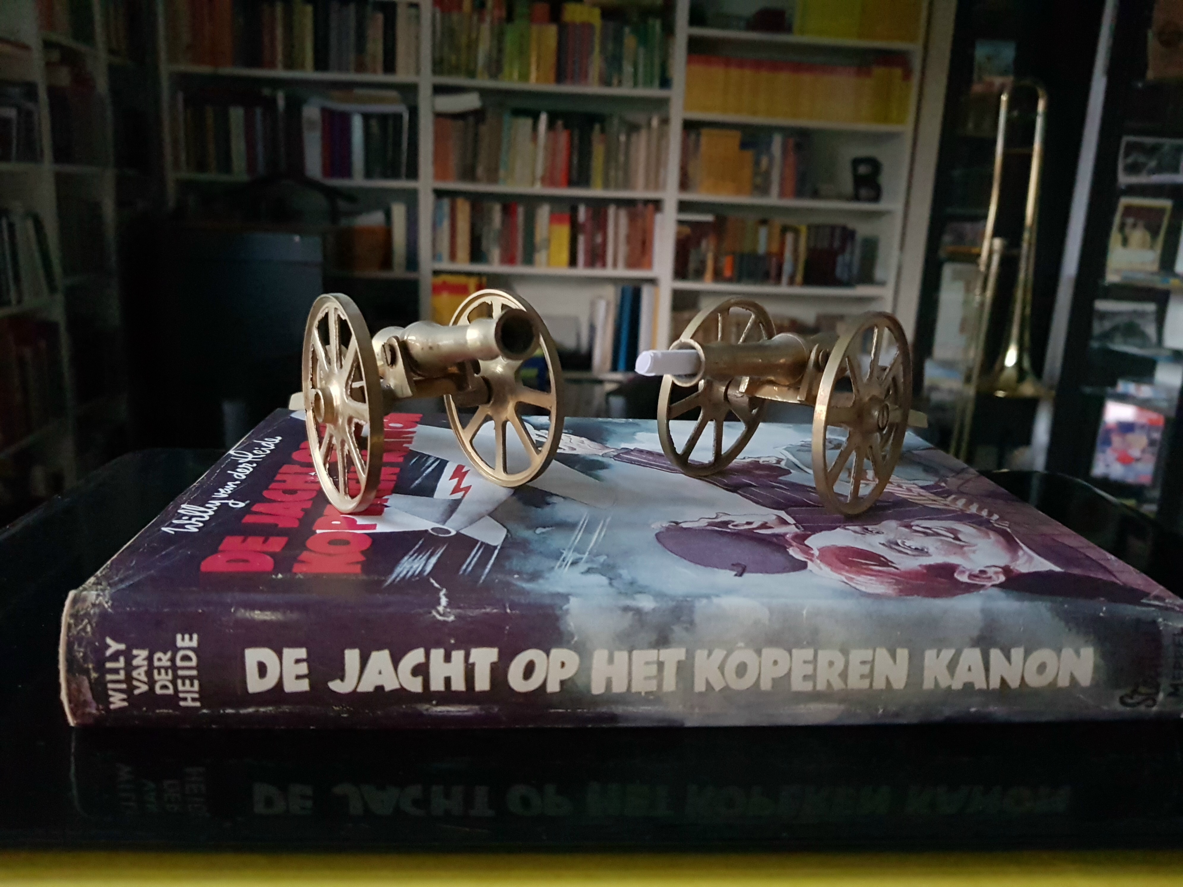 Deel 2 (pocket BE5), pagina 35: ... Er zaten nog heel wat aardige dingen bij... en... luister goed, broeders en medestrijders, men weet zich in het café heel zeker te herinneren, dat er ook een paar koperen kanonnetjes bij waren. Men weet dat zo goed, omdat die kanonnen niet apart waren verpakt, maar met een touw achter aan de wagen waren gebonden, die naar de haven reed. Twee koperen kanonnetjes, waarvan een met briefje. |