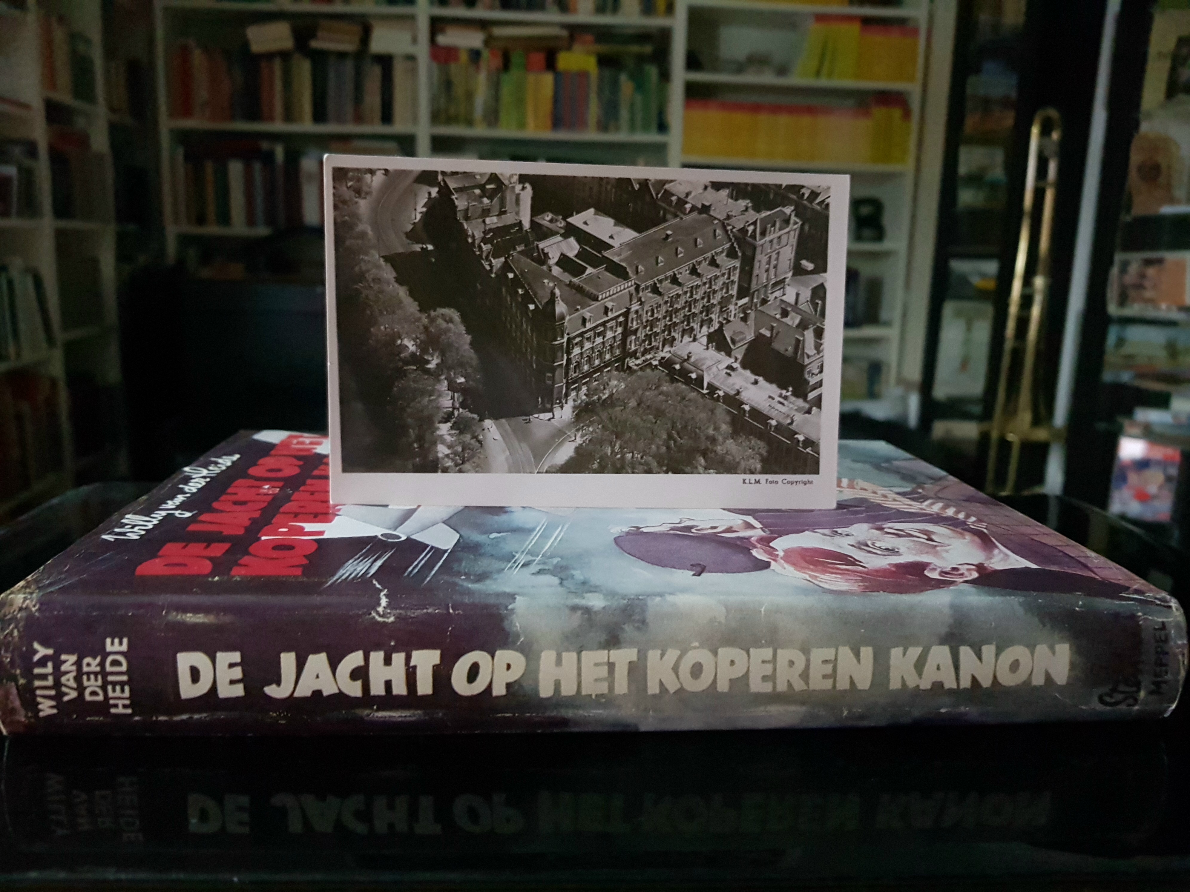 Deel 2 (pocket BE5), pagina 105: Voor Prins er erg in had stonden ze stil op het Leidsebosje. Recht voor hen uit, op de hoek van de Hobbemastraat, lag het grote Parkhotel, dat uitkeek over het Vondelpark. Jeffries was doende, zijn chauffeur te betalen. Daarna schoot hij het hotel in. Ansichtkaart van het Parkhotel (luchtfoto van de KLM). |