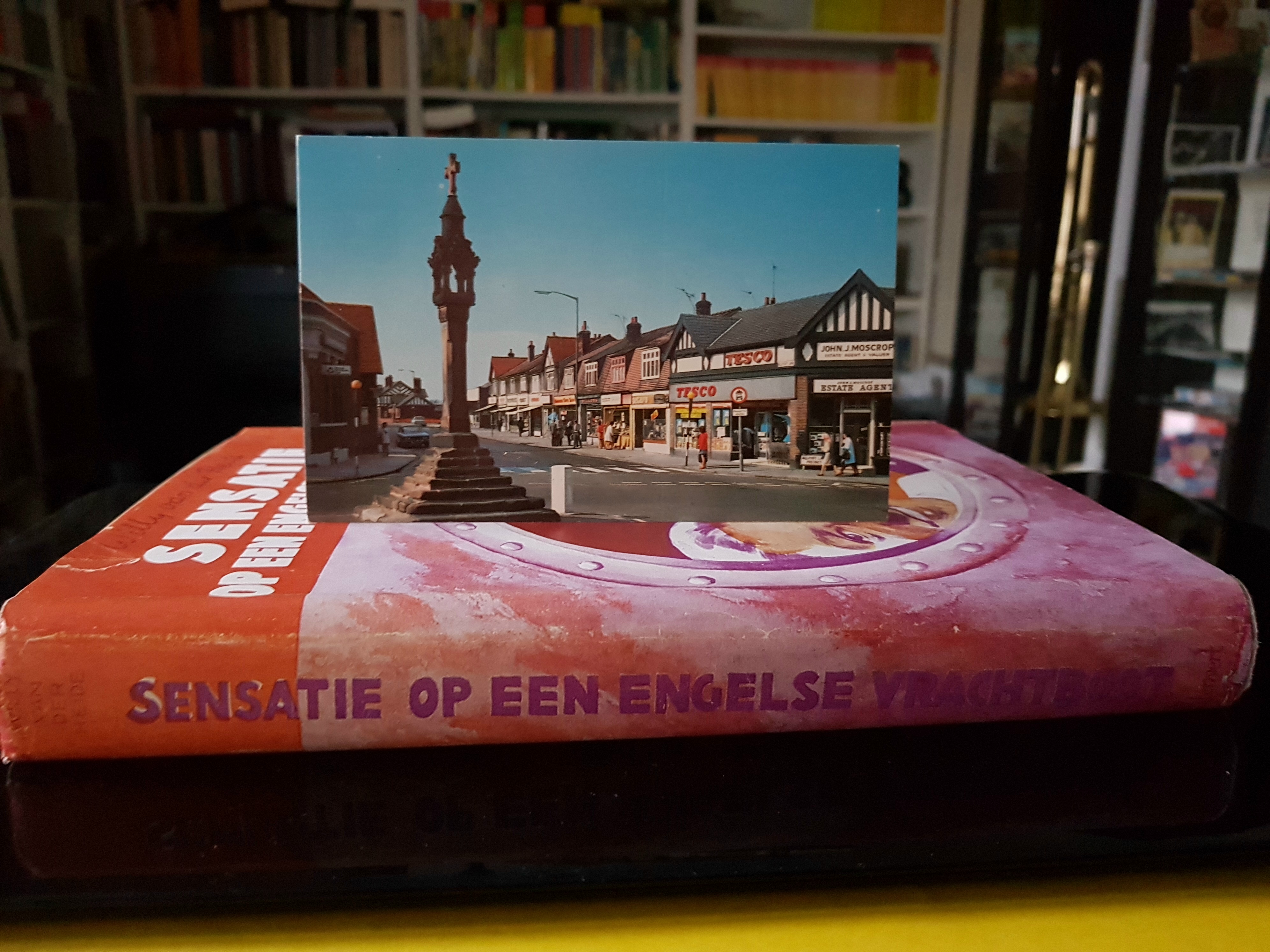 Deel 3 (pocket BE6), pagina 57: Het postkantoor, vertelde Bob, de kaart lezend, ligt aan de lange, smalle dorpsweg, in een rij huizen en winkels. Er tegenover liggen óók winkels. Maar verderop, aan beide kanten, zijn stukken open terrein en bomen. Ik stel voor, dat een van ons ergens in een portiek gaat staan, om het postkantoor in de smiezen te houden. Nummer twee posteert zich een eind verder de weg af ... Ansichtkaart van Bromborough: The Cross staat op het kruispunt van The Rake en Bromborough Village Road, dus tegenover het postkantoor. |