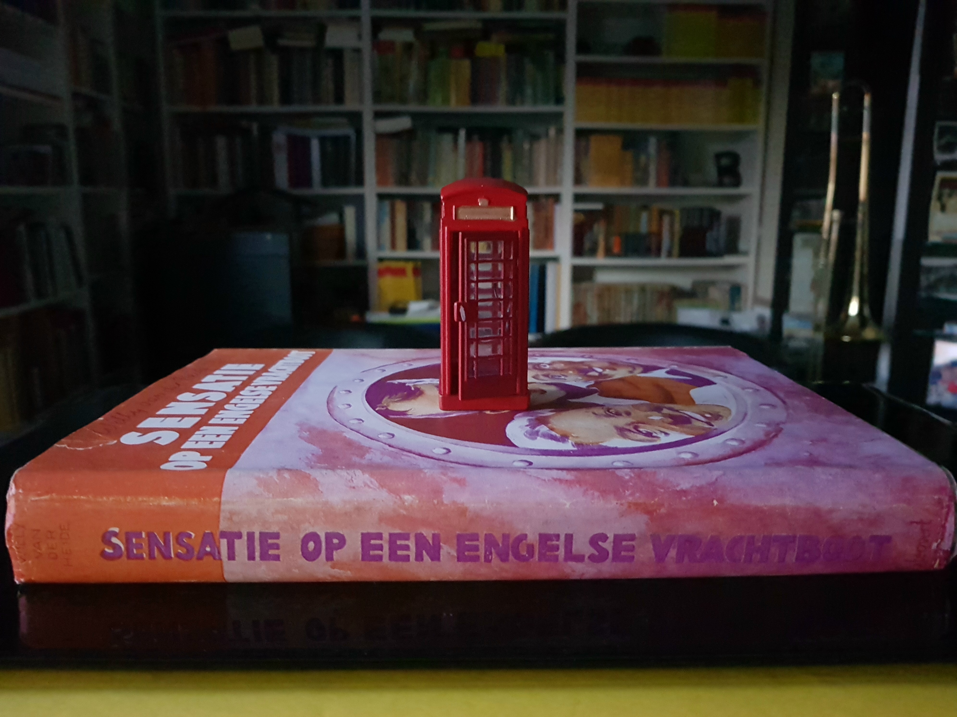 Deel 3 (pocket BE6), pagina 98: Waar het dichtbebouwde dorp ophield en de meer open weg begon, stond rechts een telefooncel. Lois stopte en samen gingen ze het hokje binnen. Het telefoonnummer van Bromborough Hotel was snel gevonden. Bob had de hoorn in zijn hand en Lois liet het muntstuk in het toestel glijden. Model van een Britse telefooncel. |