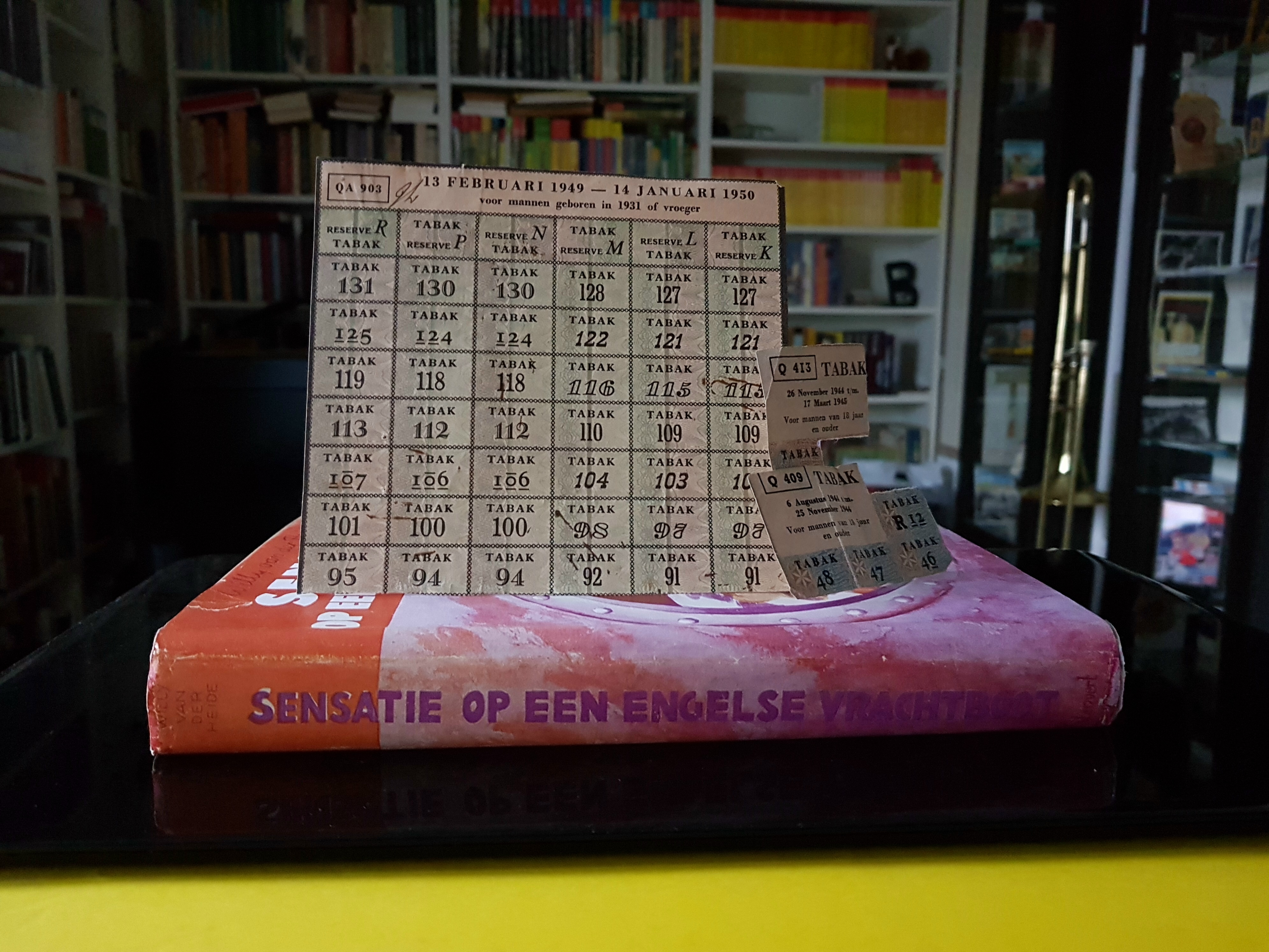 Deel 3 (pocket BE6), pagina 139: Als ze toch stoppen moesten om de weg te vragen, dook Bob of Jan een winkel in de buurt binnen om een fles melk te kopen of een stuk chocola, maar eenvoudig was dat niet, want in Engeland was zowat alles op de bon. Het duurde een vol uur voor ze genoeg bij elkaar hadden georganiseerd om hun ergste honger te stillen. (Nederlandse) tabaksbonnen uit de jaren 1944, 1945 en 1949. Ten tijde van de eerste druk van Sensatie op een Engelse vrachtboot was dus ook in Nederland nog van alles en nog wat op de bon, dus deze opmerking van Willy staat een beetje vreemd; in de pocketeditie is ze dan ook verdwenen. |