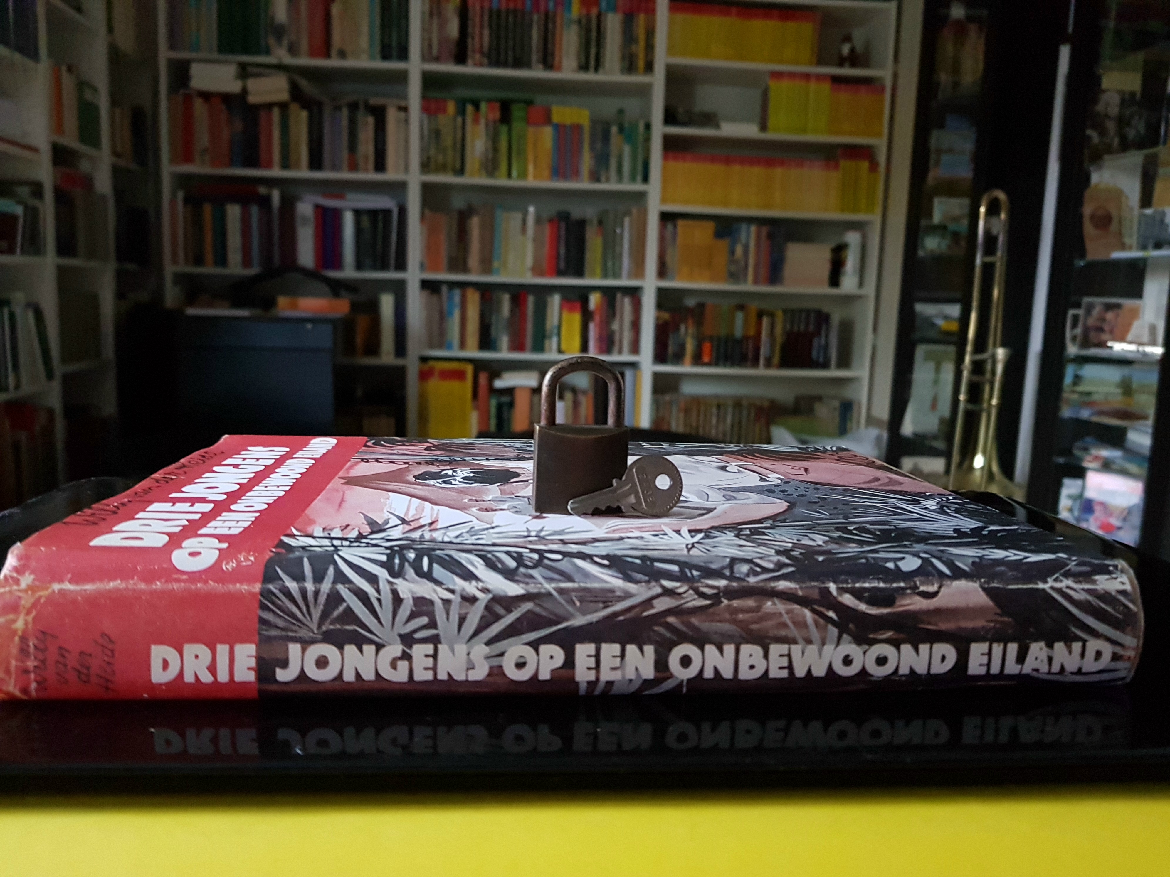 Deel 5 (pocket BE2), pagina 20: Ik ben geen rondwandelend pakhuis, zoals Arie. Alsjeblieft: een vuile zakdoek, een zeemansmes, het hangslot van de klerenkist in de kleine kajuit, compleet met sleutel... Als we nikkers ontmoeten, kunnen we dat duur ruilen. Of het opperhoofd aanbieden om als sieraad door zijn neus te dragen, zei Jan. Zon prachtig sieraad is nog nooit aan een nikker-opperhoofd aangeboden. Waar vind je anders een sieraad, dat je door je neus kunt halen en vervolgens op slot doen? Vrijwaart tegen verlies en diefstal. Ben je gek, zei Bob, we halen het Arie door zijn neus en zeggen dat hij een heel hoog en heel bijzonder opperhoofd is. [...] Hangslot met sleutel. |