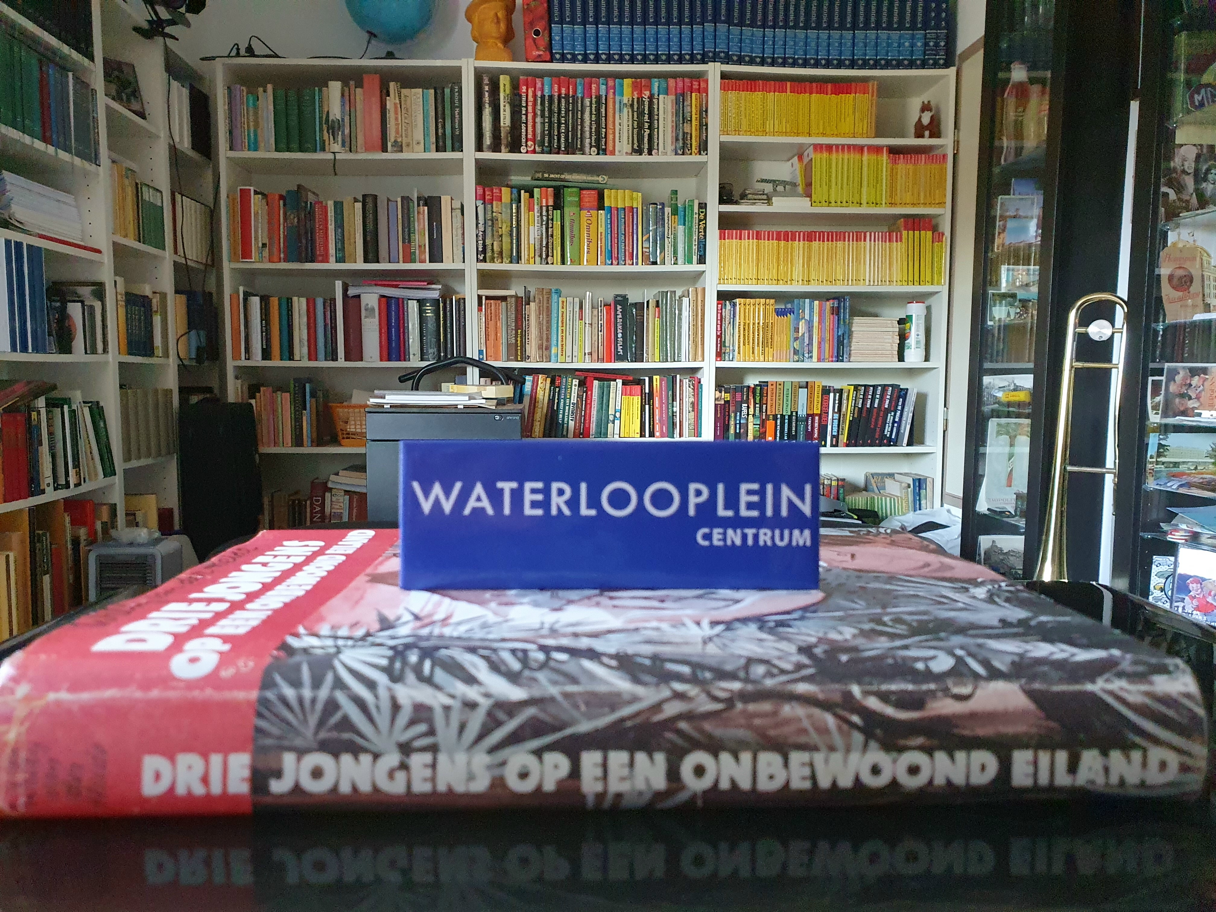 Deel 5 (pocket BE2), pagina 21: Dat is het raarste hoopje, dat ik ooit bij elkaar heb gezien. Vooral dat ene dollarbiljet ziet er zo prachtig uit. Net of een Amerikaan verzeild is geraakt op de rommelmarkt op het Waterlooplein. Nou moet ik er aan geloven. Magneetje dat een straatnaambord van het Waterlooplein voorstelt. |