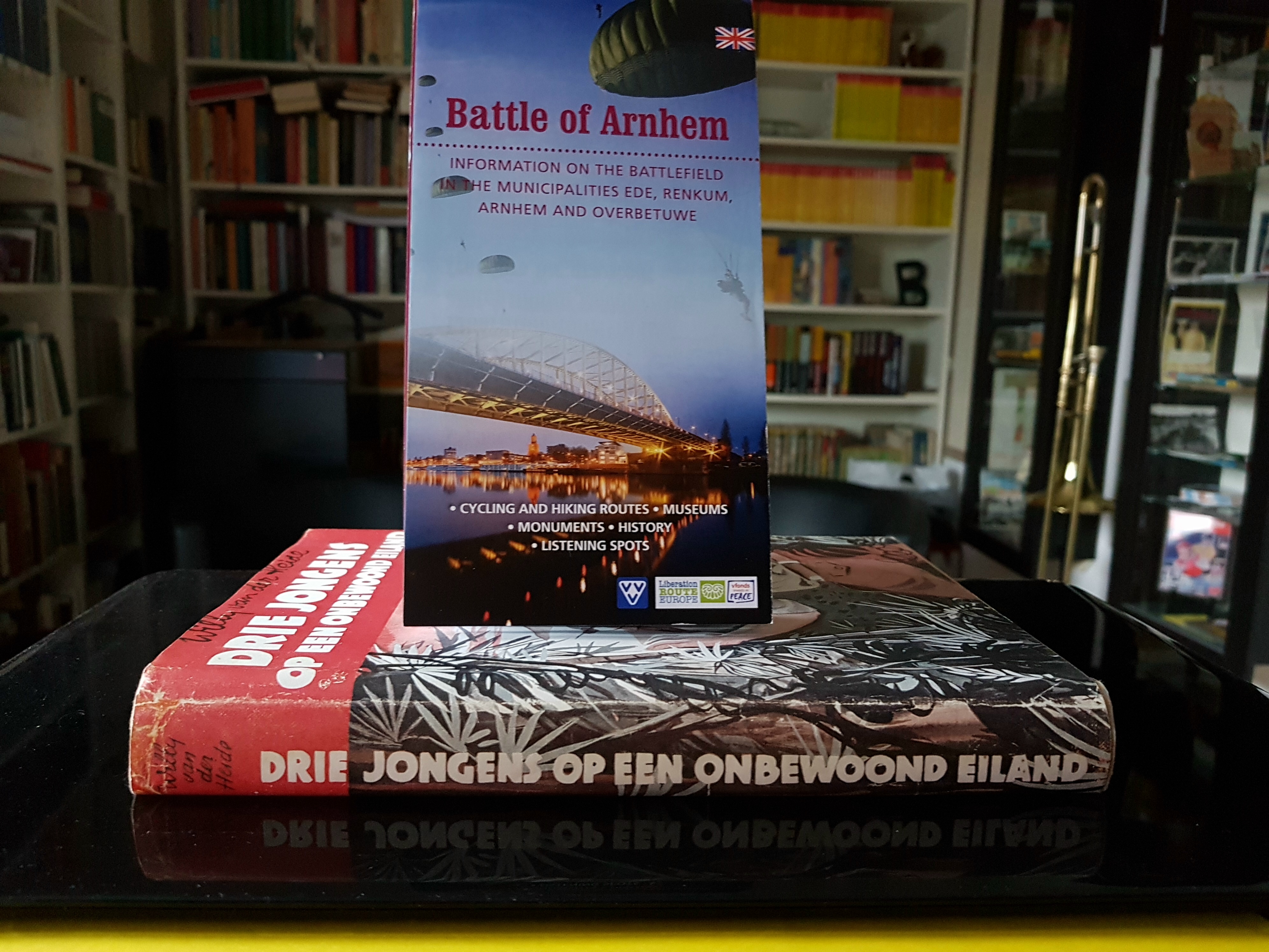 Deel 5 (pocket BE2), pagina 126: Wat is er eigenlijk met jou gebeurd? vroeg Jan aan Bob. Ik heb genoeg schoten gehoord voor de complete slag bij Arnhem. Het wàs een slag bij Arnhem, man. Ik zal je het verhaal morgen wel precies vertellen. Ik ben nu werkelijk te moe. Kaart met wandelroutes en monumenten met betrekking tot de Slag bij Arnhem. |