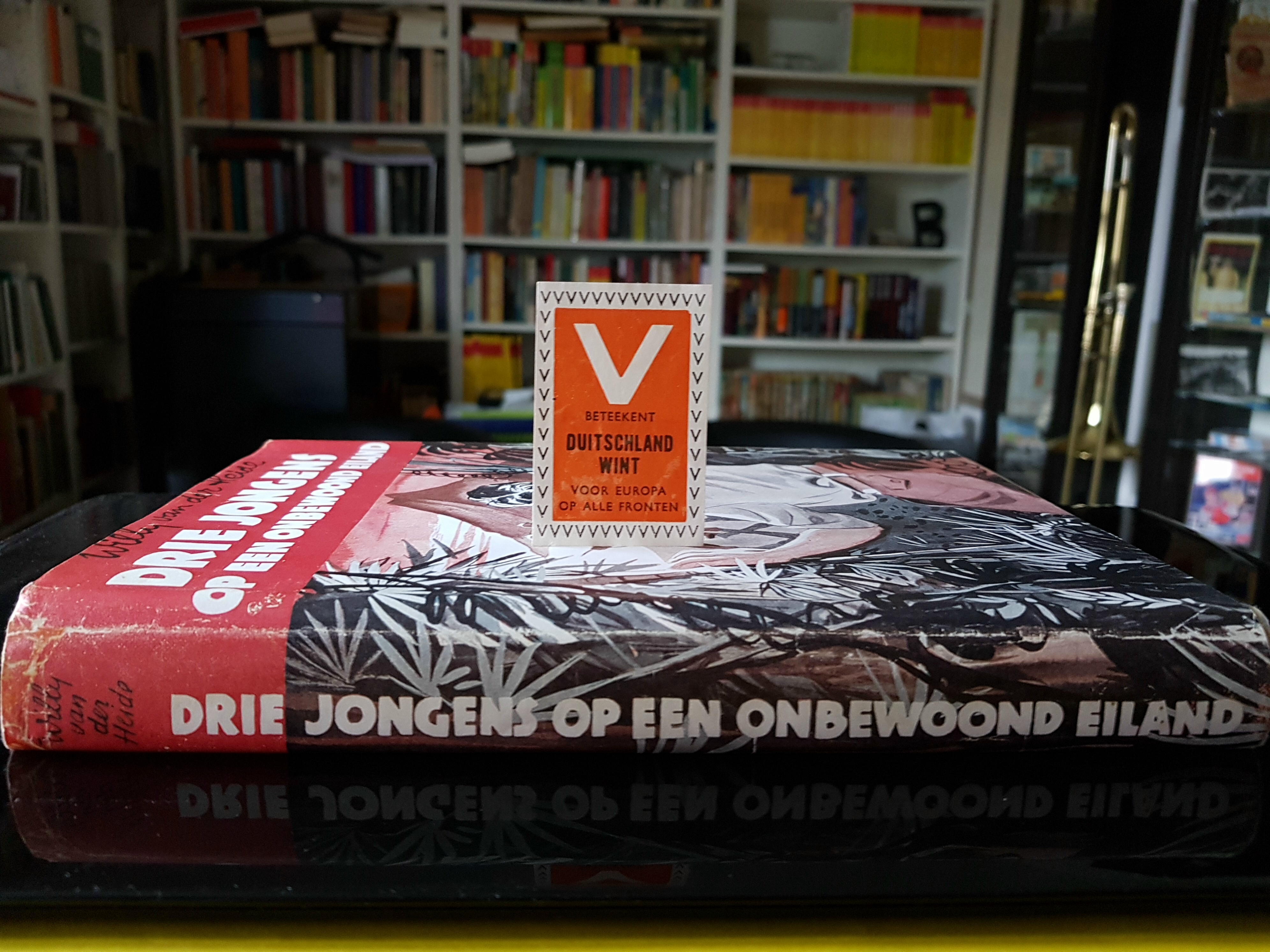 Deel 5 (pocket BE2), pagina 161: We kunnen het wel, zei Arie. We kunnen propagandateksten tekenen en die in lege flessen doen en bij gunstige wind over laten drijven. Bob keek lachend op: Ja! Zoiets als: Muiters, past op! Uw uur heeft geslagen!! Arie vloog overeind: Arie Roos wint op alle fronten! Propagandazegel uit de Tweede Wereldoorlog met de foute kreet Duitschland wint op alle fronten!, waaraan Arie zijn bizarre propagandakreet ontleent. |