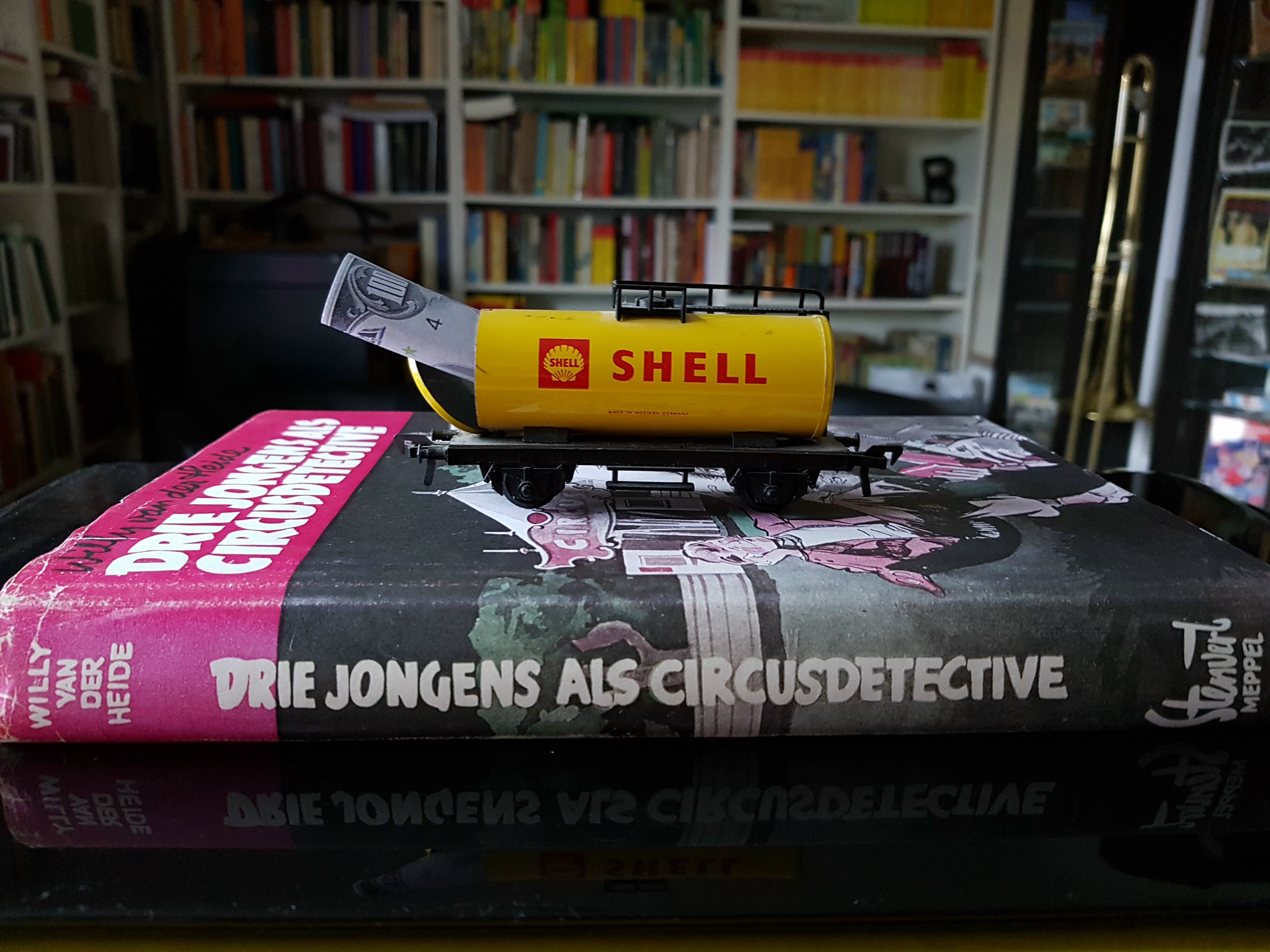 Deel 8, pagina 114: Wie heeft die dingen zo kapot gemaakt? vroeg Arie zich weer verbaasd af. Hij brandde zijn vingers aan de uitdovende lucifer, stak een tweede aan en bekeek een half stuk getrokken tankwagen. Het ronde, gele bovenstuk, met de letters SHELL erop, zat nog maar met één lipje vast aan het platte onderstel. [...] Het licht spatte aan en Arie trok van verbazing zijn adem hijgend naar binnen. Tussen zijn knieën en over de halfvernielde treinwagons heen lag een collectie Amerikaanse dollarbiljetten! Arie bevoelde ze haastig, Splinternieuw... ongevouwen... allemaal van één honderd dollars. Model van een Shell-tankwagen met daarin een echt vals 100-dollarbiljet. |