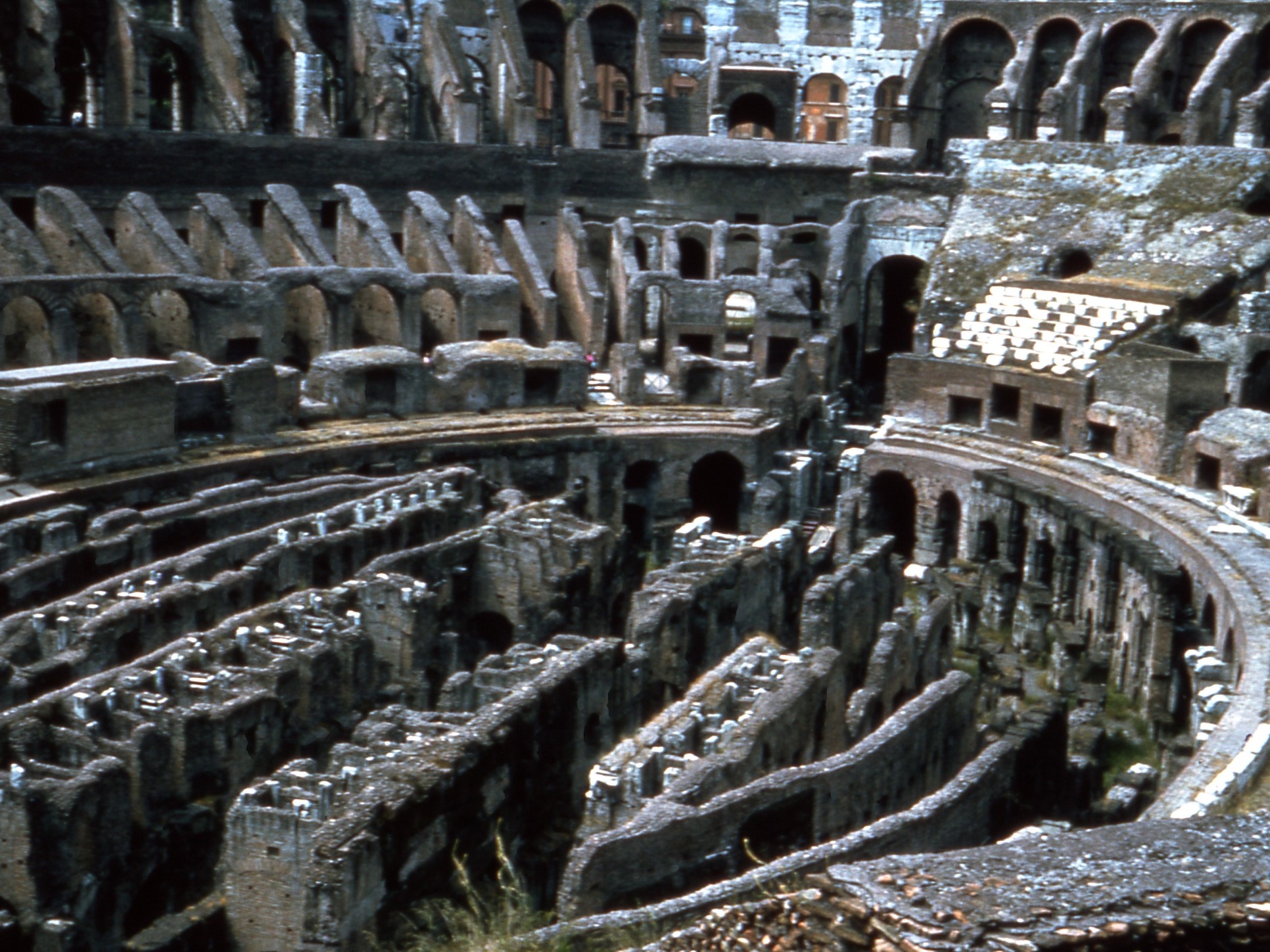 Het interieur en de catacomben van het Colosseum. Het amfitheater kon ooit 50.000 toeschouwers bevatten (2½ keer het Parkstad Limburg Stadium, anders gezegd: net zo veel als de Kuip). Van de oorspronkelijk in wit marmer uitgevoerde zitplaatsen zijn (links op de foto) alleen nog enkele zitplaatsen van de senatoren bewaard gebleven. © foto Brigitta Maassen |